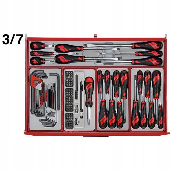 - полный набор инструментов помещается в 4 из 7 доступных ящиков - в оставшемся ящике есть место для дополнительных инструментов, которыми можно дополнить набор при необходимости