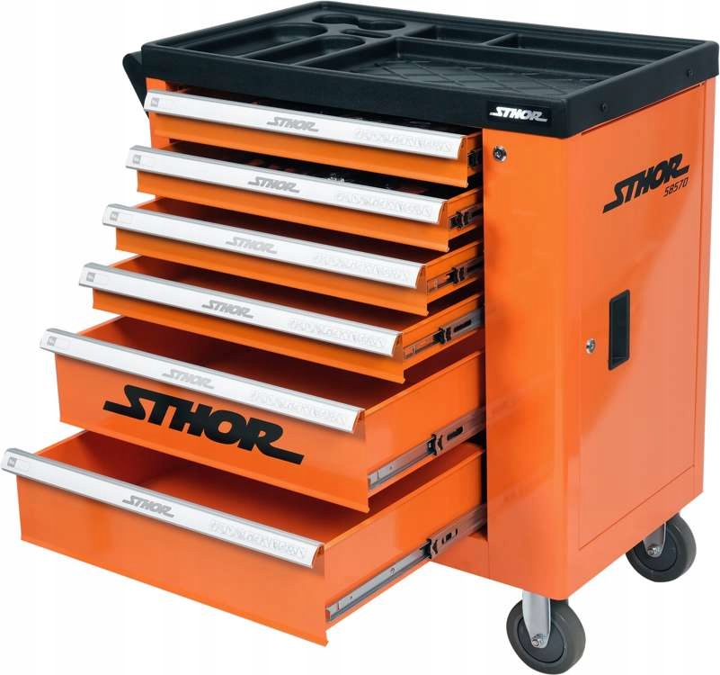 сервисный шкаф с инструментами марки STHOR. Он имеет 6 ящиков на шариковых направляющих, оснащенных 4 пластиковыми модулями с инструментами и дополнительным хранилищем для более крупных предметов.п>