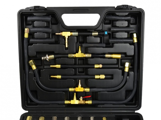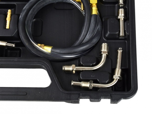 измеритель давления впрыска бензиновой системы. В комплект входит легко читаемый манометр, а также комплект шлангов и соединительных адаптеров. Тестер позволяет измерять давление форсунок в большинстве автомобилей, доступных на европейском рынке.