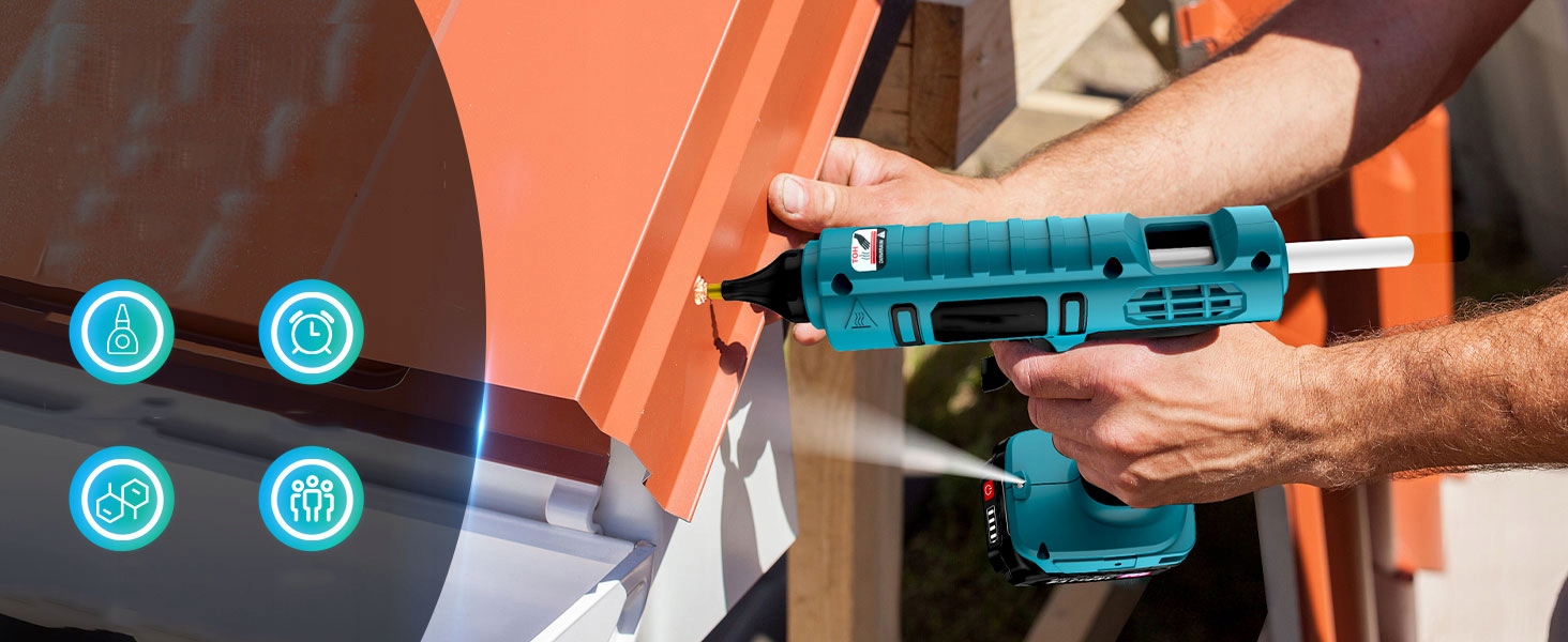 • Беспроводной клеевой пистолет также оснащен изолированной насадкой с тонким наконечником, предотвращающей капание, которая эффективно уменьшает проливание клея и может эффективно сократить потери клея на 15%, экономя больше клеевых стержней и сохраняя рабочее место чистое.