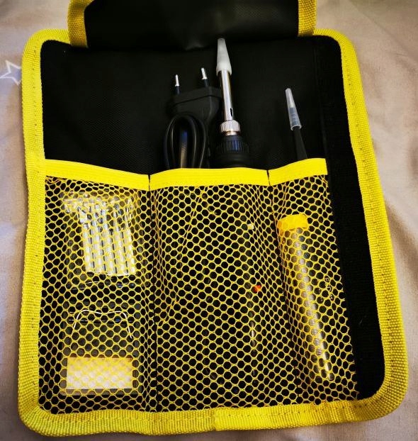 Это паяльная папка - банка, 5 дополнительных жал, подставка с губкой, канифоль, ключ для замены жал и чехол на липучке с небольшой ручкой для переноски.