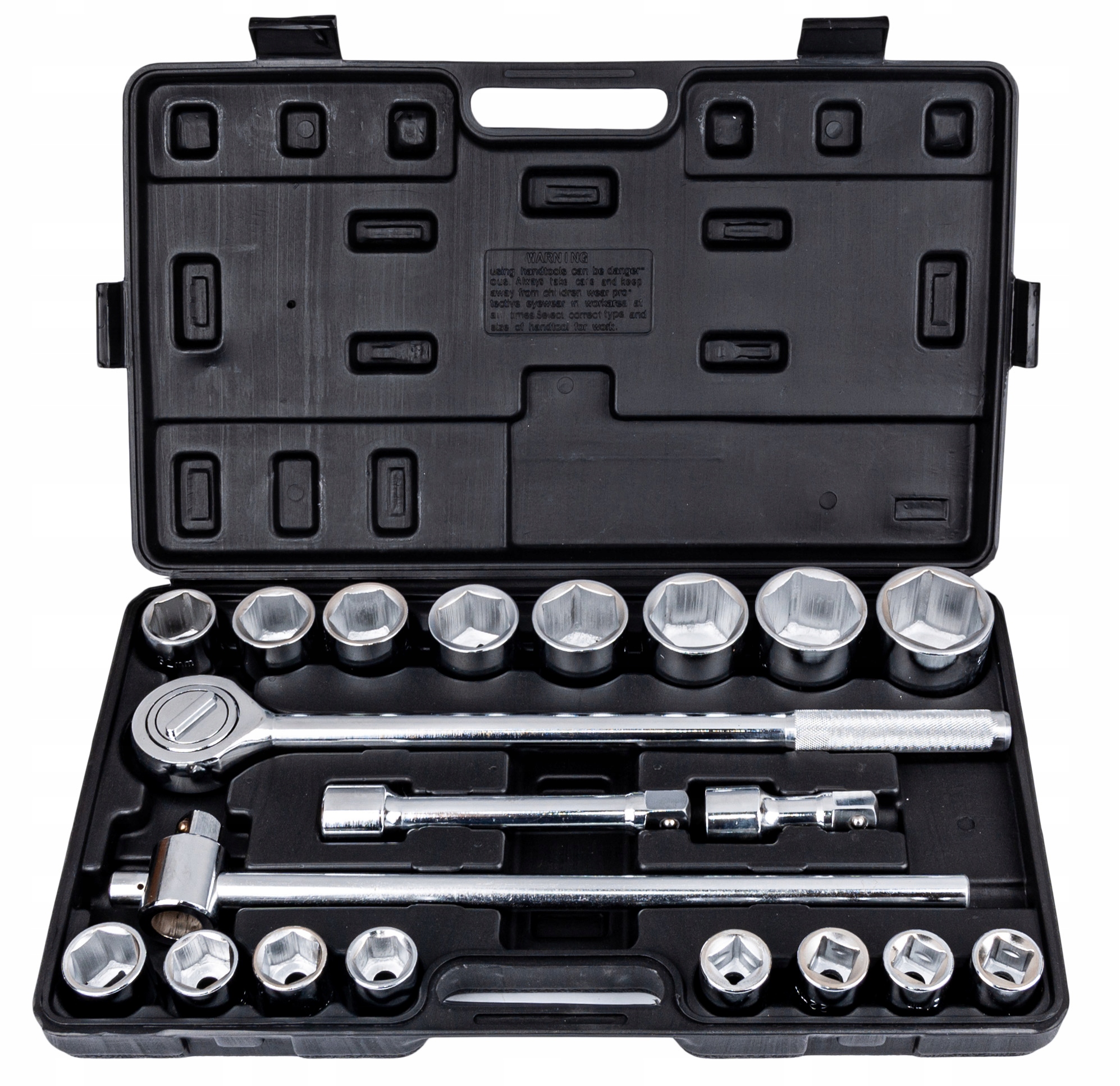 набор состоит из 21 el. изготовлен из высококачественной стали CRV. Необходимые в любом автосервисе, насадки такого размера помогут при ремонте грузовиков или сельскохозяйственной техники. Идеально подходит для отвинчивания или затяжки больших винтов