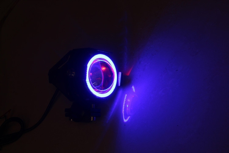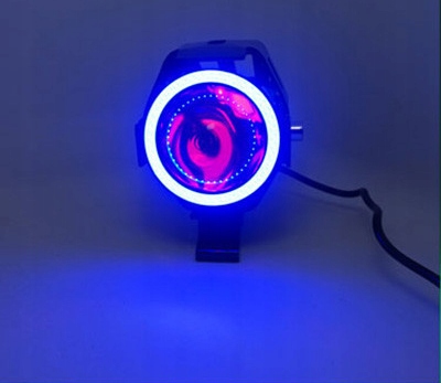 цвет корпуса черный с синим кольцомсветодиодные фары мотоцикла с белым или синим кольцом. Обладая ближним, дальним и стробоскопическим светом дополнительное кольцо синего цвета, водонепроницаемый корпус свет мощностью 30 Вт