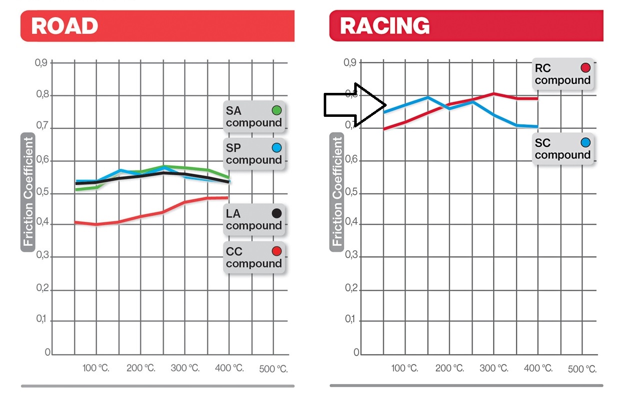 при низьких температурах коефіцієнт тертя досягає 0,75, тоді як висока модель Brembo SA(Червона) отримує коефіцієнт тертя - 0,5! Колодки SC підтримують чудову гальмівну здатність в повному діапазоні температур до кінця charakrerist.