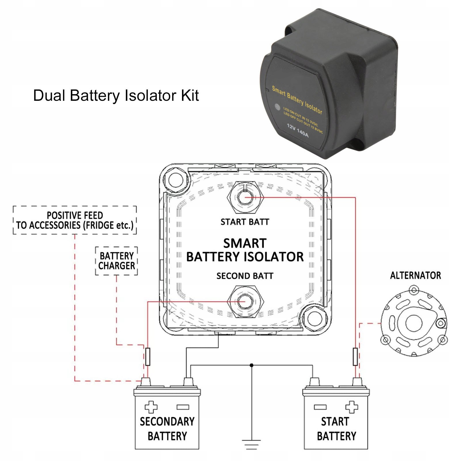 1. Комплект подвійного ізолятора батареї: автоматичний подвійний ізолятор батареї на 140 А – це все, що вам потрібно для заряджання двох батарейних систем. Він працює як два окремих джерела живлення.