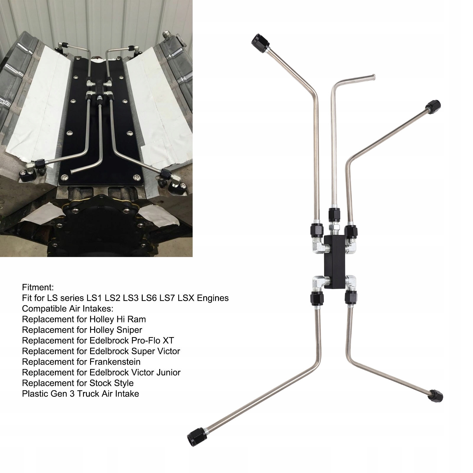 2. Сумісні повітрозабірники: заміна на Holley Hi Ram; Заміна Holley Sniper; Заміна для Edelbrock Pro‑Flo XT; Заміна Edelbrock Super Victor; Заміна Франкенштейна та інше.