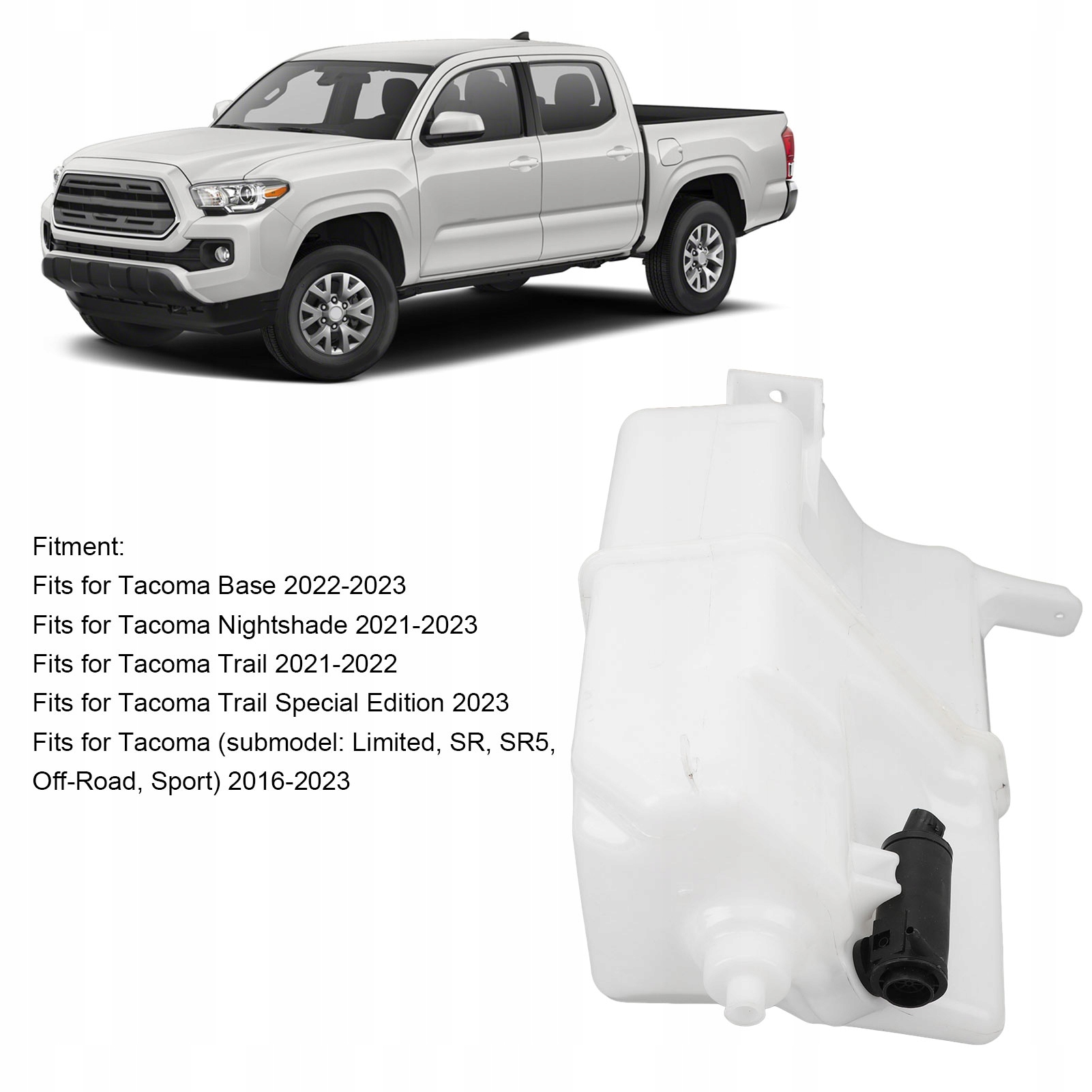 2. Пристосування: резервуар омивача лобового скла замінює Tacoma Base 2022-2023, Tacoma Nightshade 2021-2023, Tacoma Trail 2021-2022, Tacoma Trail Special Edition 2023.