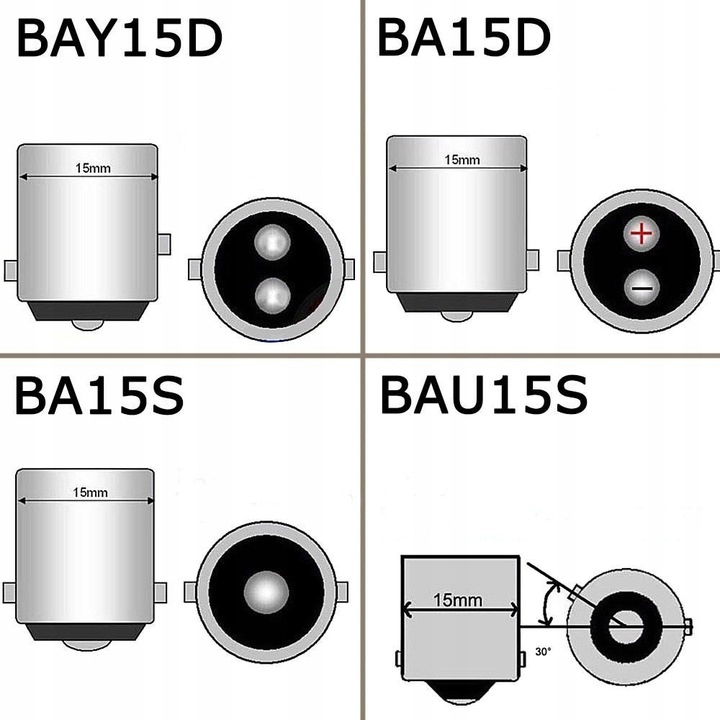• 2x лампи з подвійним світлодіодним золотом з вилкою під розеткою BAU15S / PY21W - вилка має штирі, розташовані під кутом 150 градусів, несиметрично.
