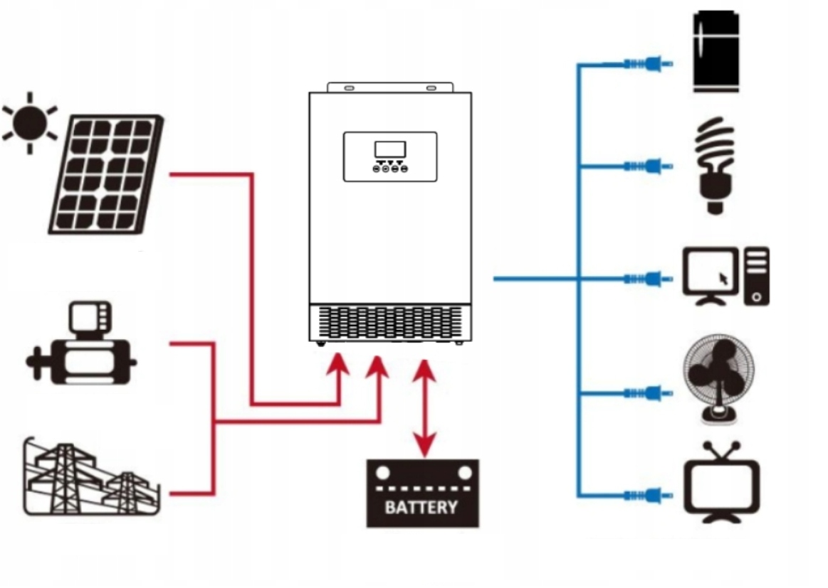 це багатофункціональний інвертор-поєднання функцій MPPT Сонячне зарядний пристрій і зарядний пристрій для забезпечення безперебійної підтримки живлення.