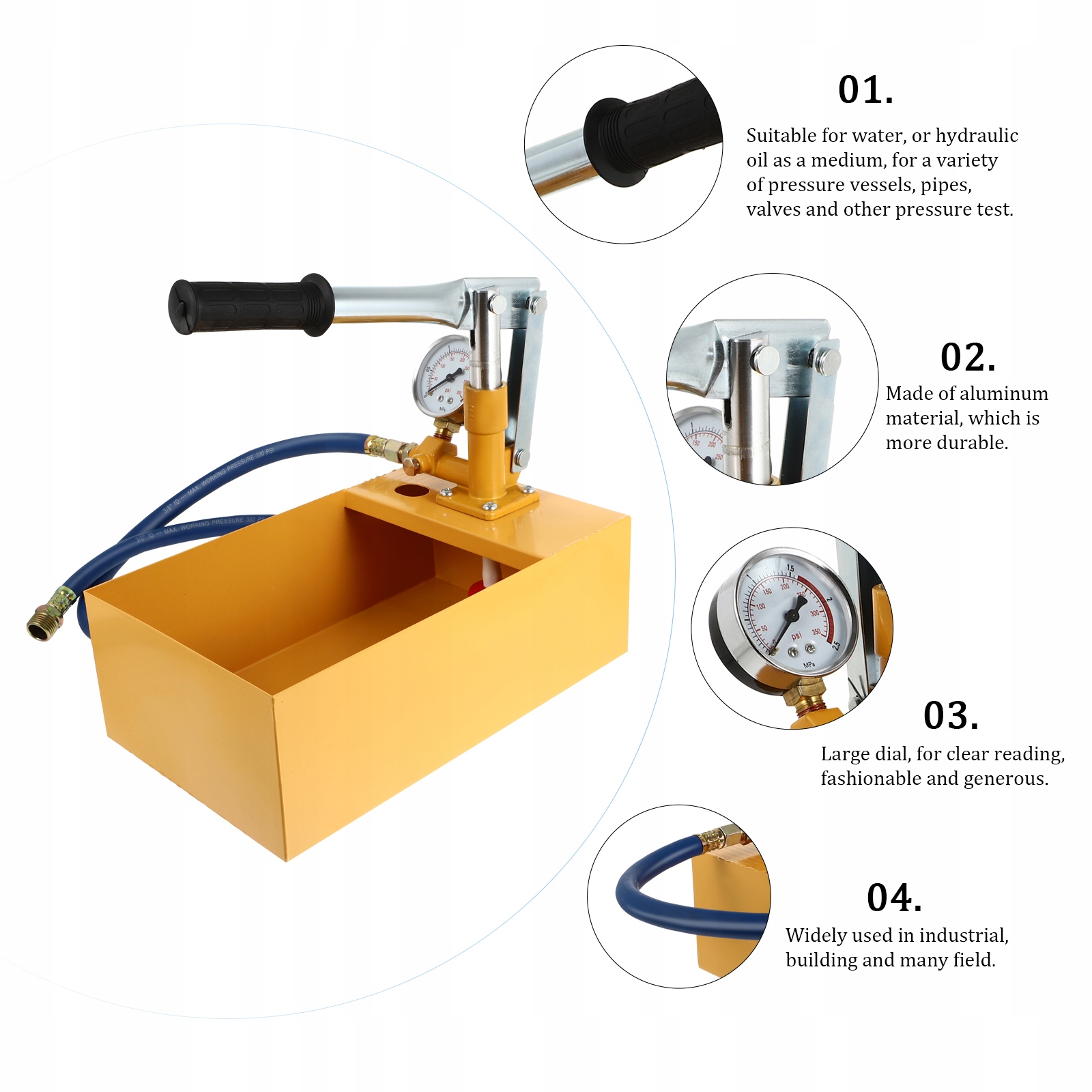 Підходить для води або гідравлічного масла як середовища, для різних ємностей під тиском, труб, клапанів та інших випробувань під тиском.