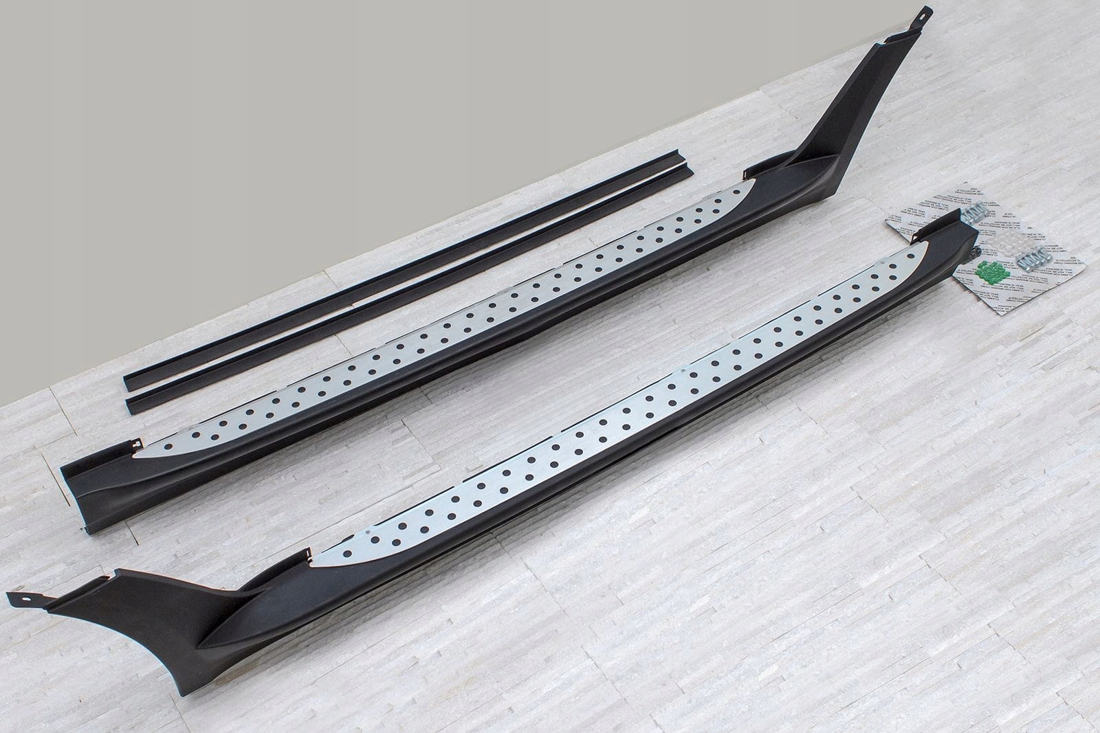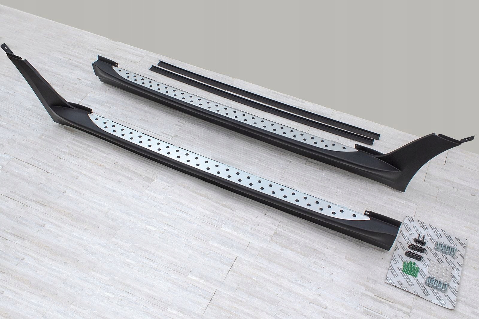 в комплекті набір бічних ступенів (праворуч і ліворуч), монтажне обладнання та інструкція. Пороги встановлюються на заводських монтажних точках. Монтаж ступенів не вимагає свердління додаткових отворів! Ми рекомендуємо професійну установку в майстерні (З досвіду знаємо, щонайкраще скористатися послугами лакофарбового або листового заводу, тому що саме ці заводи найчастіше займаються монтажем планок, спідниць і ступенів, тому монтаж для цих заводів єінтуїтивним дією ). е>