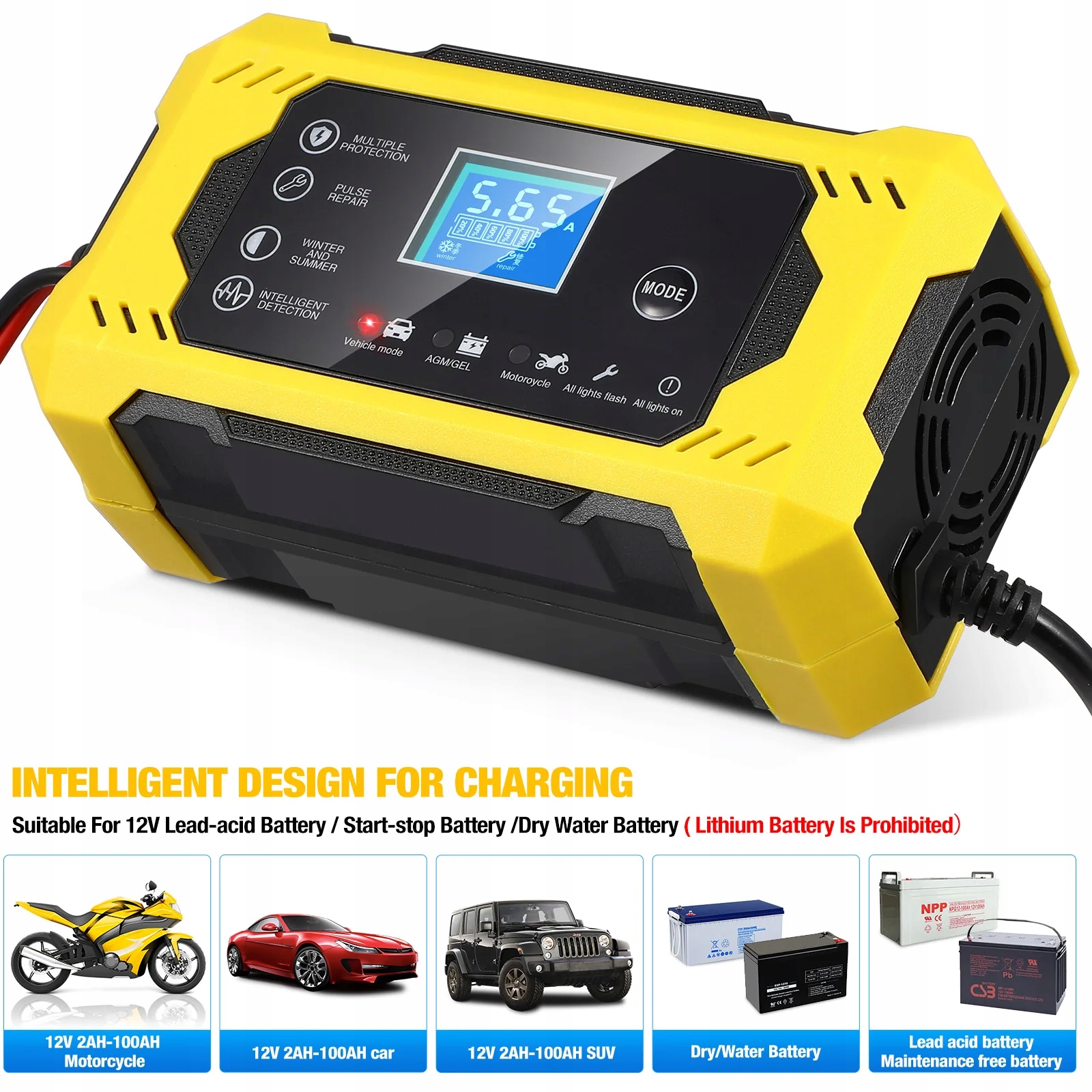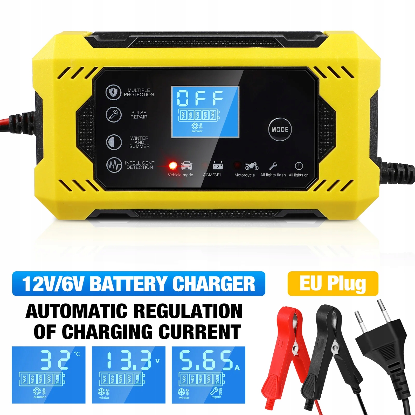 особливості колір: як показано матеріал: пластик і метал Розмір: 15, 00x8, 50x6, 00 см/5, 89x3, 34x2, 36 дюйма довжина вхідної лінії: 85 см Довжина вихідної лінії: 55 см Потужність: 90 Вт (макс.) Вхідна напруга: AC 110230v вихідна напруга: постійний струм 13,815,5 В Вихідний струм: DC 6A універсальний захист: має функції безпеки, такі як захист від зворотної полярності, захист захист від перевантаження, захист від перенапруги, захист від перезаряду та захист від перегріву, тому Ви можете використовувати його без занепокоєння. Автоматичне виявлення: автоматично визначає зовнішню температуру, а потім автоматично запускає зимовий та літній режим, вибирає відповідну напругу зарядки відповідно до температури, не потребує регулювання та простий у використанні. Цифровий дисплей: автомобільний зарядний пристрій має чіткий цифровий дисплей, який може автоматично відображати вологість, струм, напругу, відсоток акумулятора тощо, щоб ви завжди могли знати стан зарядного пристрою. Інтелектуальний режим зарядки: налаштуйте режим повільної зарядки і режим швидкої зарядки, інтелектуальна зарядка автоматично зупиниться після повної зарядки, підключіть акумулятор і підключіть адаптер живлення для автоматичної зарядки без регулювання. Широка сумісність: підходить для акумуляторів 12 В, підходить для зарядки багатьох типів транспортних засобів, таких як мотоцикли, автомобілі, позашляховики, сухі батареї позашляховиків, водні акумулятори (літієві батареї заборонені для зарядки), також може використовуватися для човнів, квадроциклів, газонокосарка і т. д. < / п>