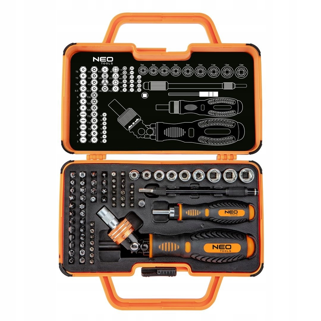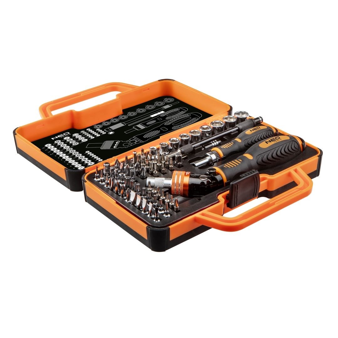 викрутки з ручкою 69 шт.NEO (ref № 06-116) набір з 55 викруток і 9 насадок з високоякісної хромованадіевой стали, що забезпечують тривалий термін служби інструменту. Ергономічні ручки, покриті нековзним матеріалом, забезпечують високий комфорт у використанні. Використовуваний храповий механізм в ручці дозволяє заощадити час під час роботи. Крім того, в комплект входять два еластичних і жорстких подовжувача, які ефективно полегшують роботу. NEO виправдовує очікування професіоналів.е>