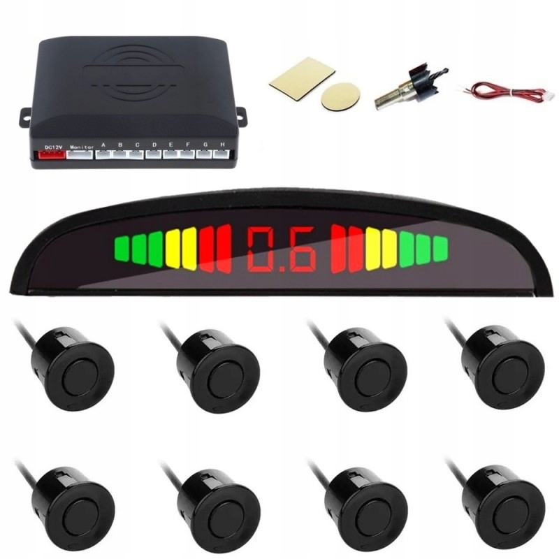 універсальні ультразвукові датчики 25 мм, набір 8 датчиків паркування з блоком управління, і зумер (зумер), який видає звуковий сигнал, збільшуючи свою частоту зі зменшенням відстані від перешкоди. Піки все швидше і швидше, чим ближче до перешкоди знаходиться машина. Датчики чорного кольору, але їх можна перефарбувати в будь-який колір.