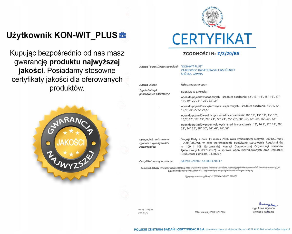 Ми працюємо професійно і маємо великий досвід і знання в цій темі. Підтвердженням цьому є отримані нами протягом багатьох років сертифікати в області ремонту шин для легкових, вантажних, сільськогосподарських і промислових транспортних засобів, які нам видають польським Центром досліджень і сертифікації sa.