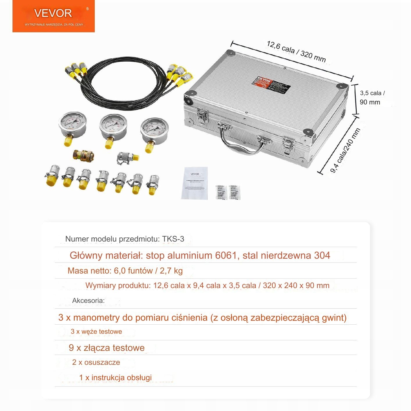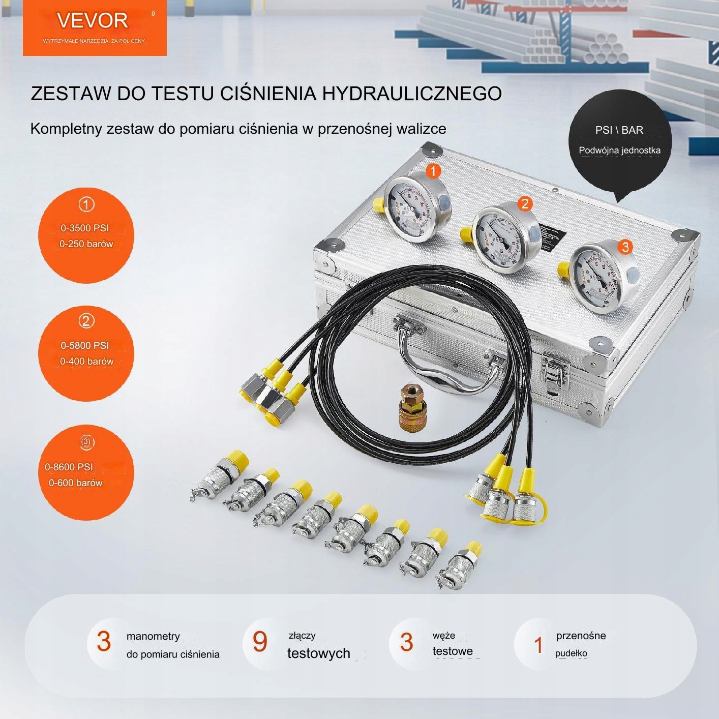 Цей набір містить три тестові манометри з діапазонами тиску: 0-250 бар, 0-400 бар і 0-600 бар, що забезпечує універсальне використання на різних типах машин , від екскаваторів до гідравлічних пресів.