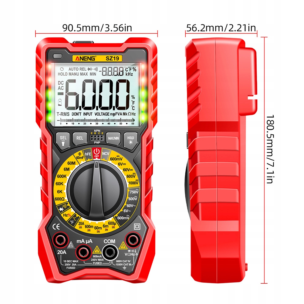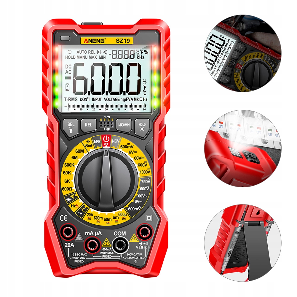 багатофункціональний, може перевірити напругу змінного і постійного струму, струм змінного і постійного струму, опір, ємність, частоту, температуру і т.д.