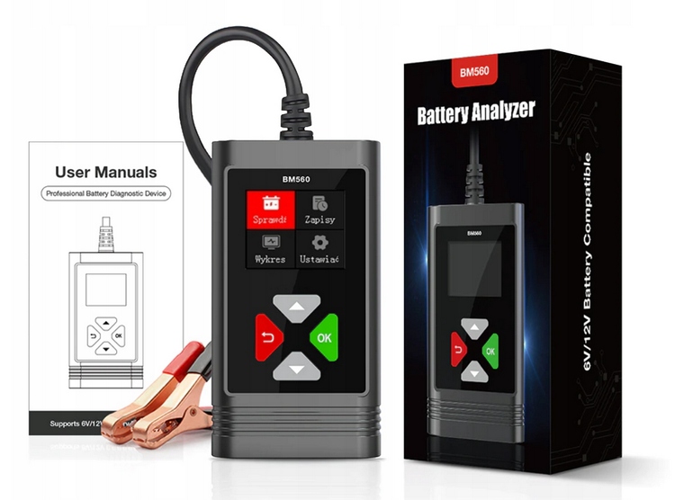 тест батареї напруги 6V і 12V, і дуже широкий діапазон вимірювання струму від 2AH до 220ah !!! модель obdresource BM560 тестер працює польською мовою!!обладнання від ексклюзивного авторизованого польського дистрибутива OBDResource!