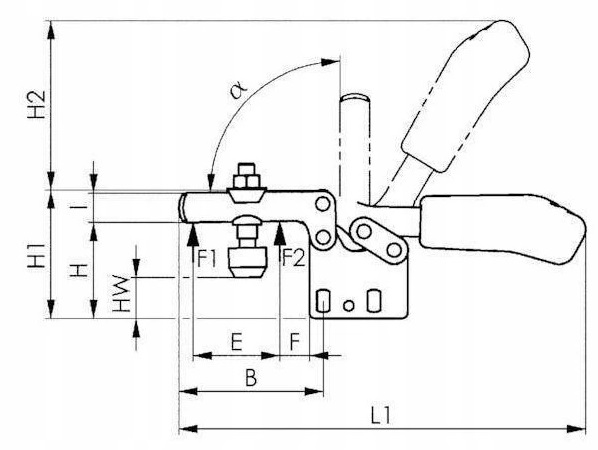 виконання: горизонтальний затиск з відкритою рукою і горизонтальною ногою. Оцинкований і пасивований. Заклепки з нержавіючої сталі переміщуються в підшипникових втулках, які були науглерожені, загартовані і відпущені; через брак місця це не відноситься до розмірів 0 і 1. Точки підшипників змащуються.е>