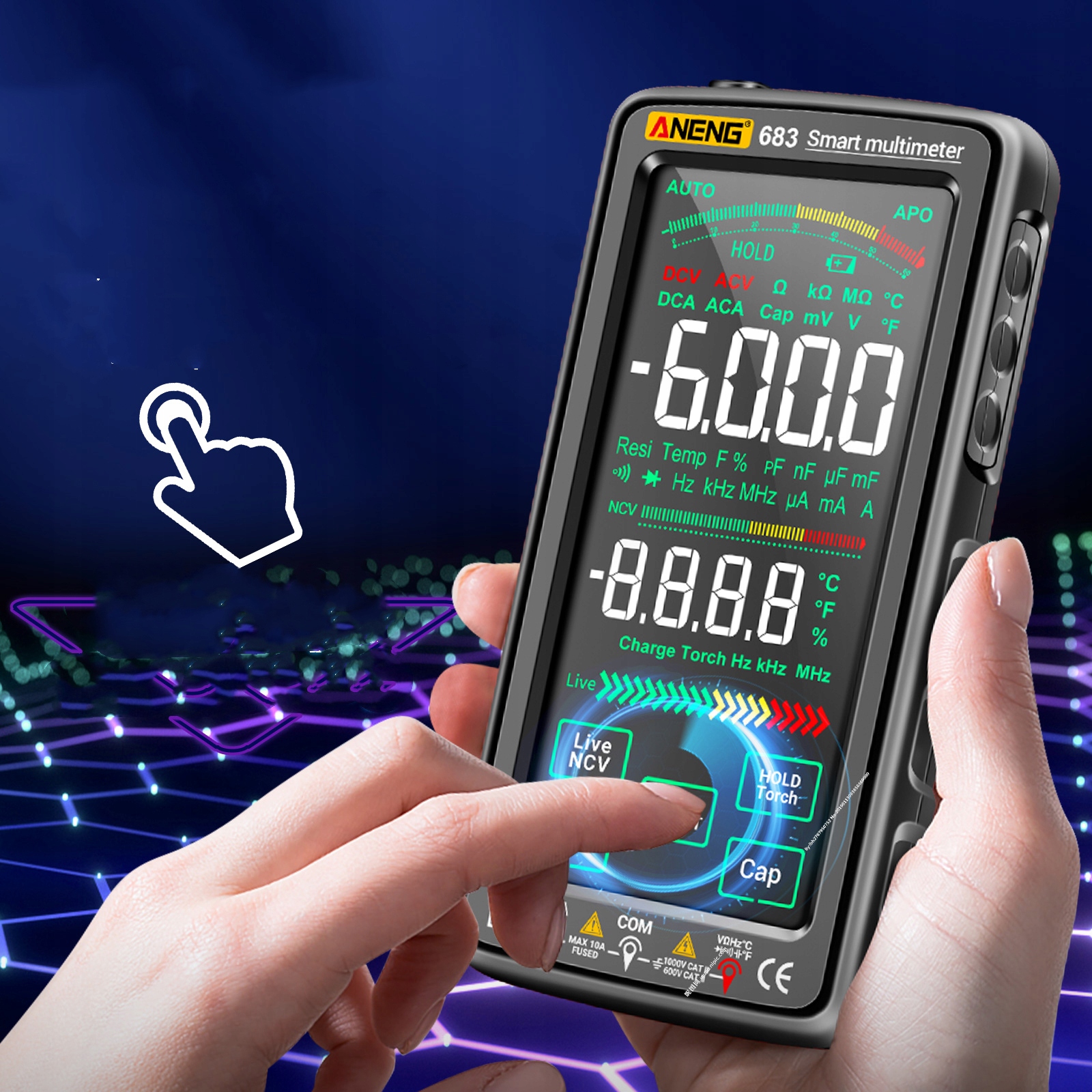 Багатофункціональний тестер: включаючи функції вимірювання потужності змінного/постійного струму, струму змінного/постійного струму, опору, ємності, температури, частоти, діода, зумера, нульової лінії вогню, робочого циклу тощо.