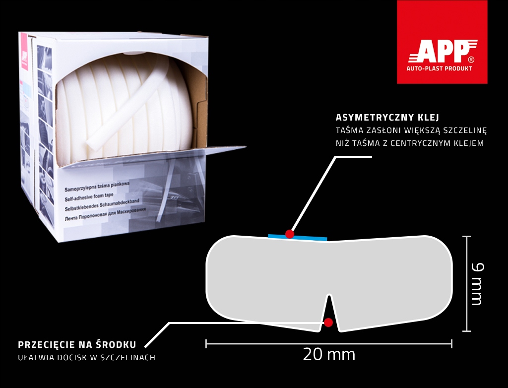 App Wide Tape < /B> - це багатоцільова гнучка самоклеюча пінопластова стрічка, призначена для захисту зазорів між дверима, кришками двигуна і багажником і їх порожнинами в кузові автомобіля. У той же час він забезпечує м'які і плавні переходи наноситься лаку по краях порожнин і надрізів кузова.е>