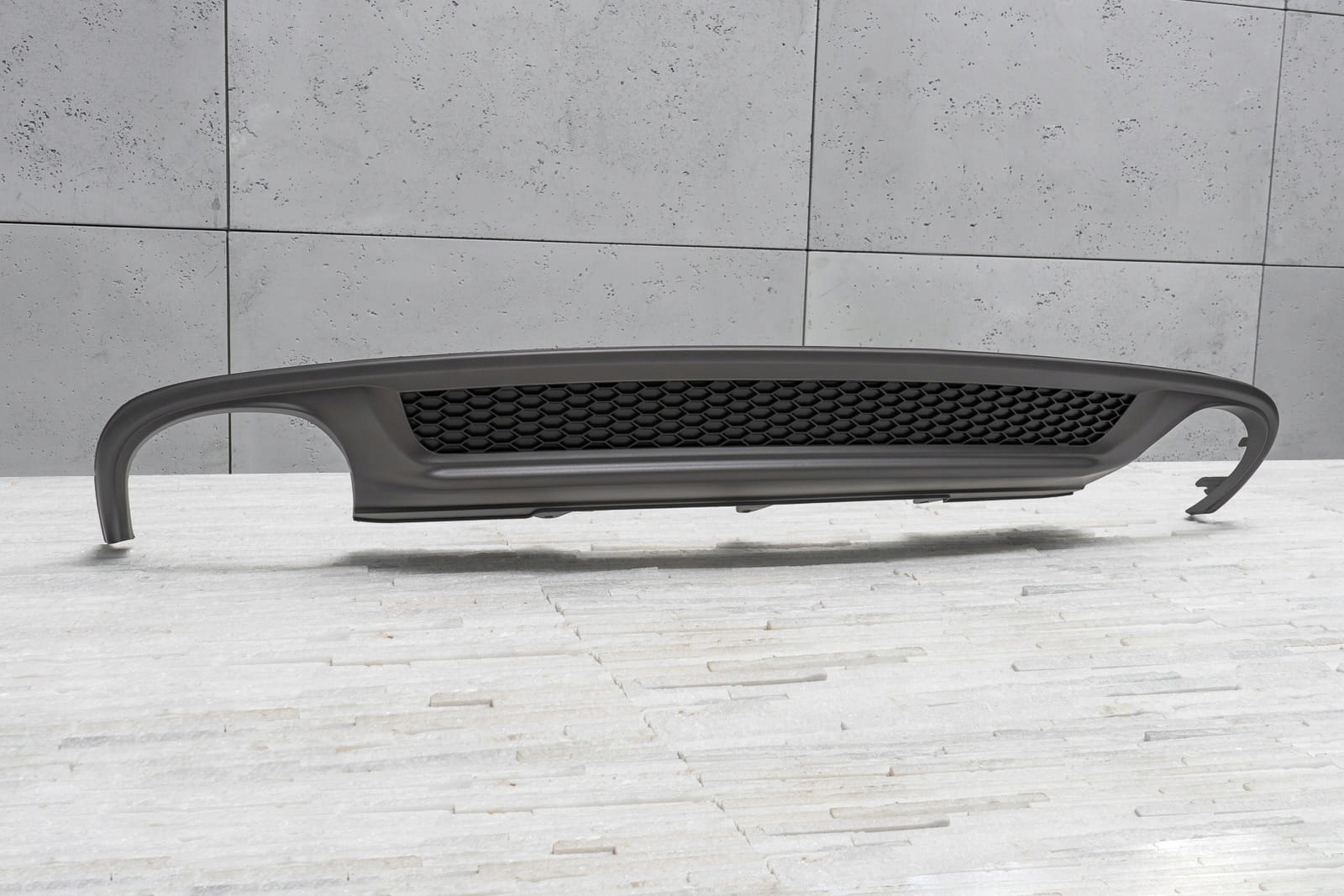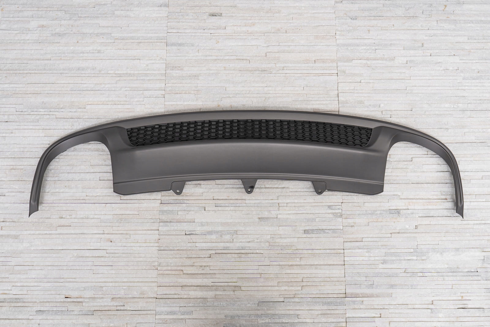 характерний подвійний вихлоп дозволяє домогтися ефекту укладання Audi A4 на версії S4.    Дифузор розроблений так, щоб ідеально поєднуватися з іншими елементами оздоблення, доповнюючи динамічний і спортивний характер вашого автомобіля. Крім візуальних якостей, дифузор покращує аеродинаміку автомобіля, а також зменшує шум повітря, який проходить під автомобілем.   Виріб виготовлено з високоякісного автомобільного АБС-пластика антрациту і чорного кольору. Дифузор додатково прикрашений стільниковим посиленням, що нагадує стиль спортивних автомобілів.   У комплект поставки входить монтажне обладнання.   дифузор-це запасна частина, сумісна з місцем установки в задньому бампері автомобіля. Для установки елемента. необхідно розібрати спідницю бампера, потім замінити її стилізованим дифузором.