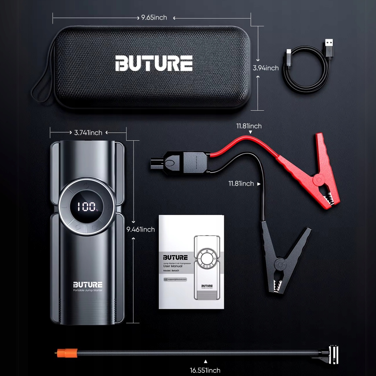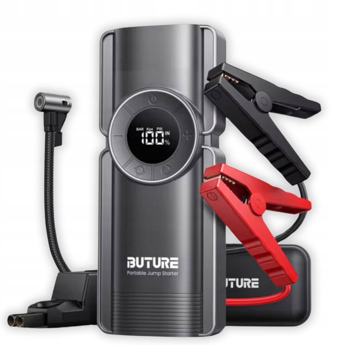 Buture Bate1 — це інноваційний пристрій, створений, щоб забезпечити вам максимальний комфорт і безпеку в будь-якій ситуації. Надзвичайно функціональний, з високою потужністю та ефективністю, він є ідеальним рішенням для кожного водія. Bate1 — це поєднання аварійного стартера, повітряного компресора, павербанка та світлодіодного ліхтарика — все в одному пристрої.