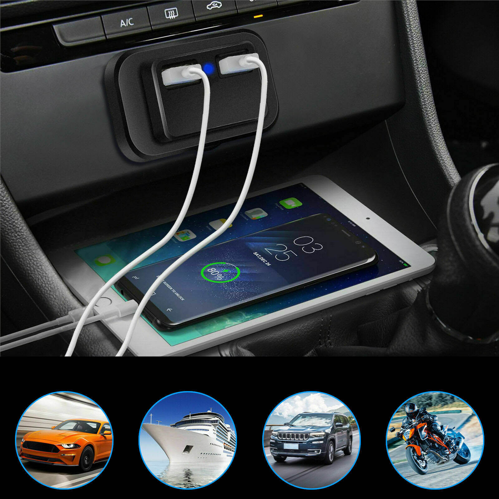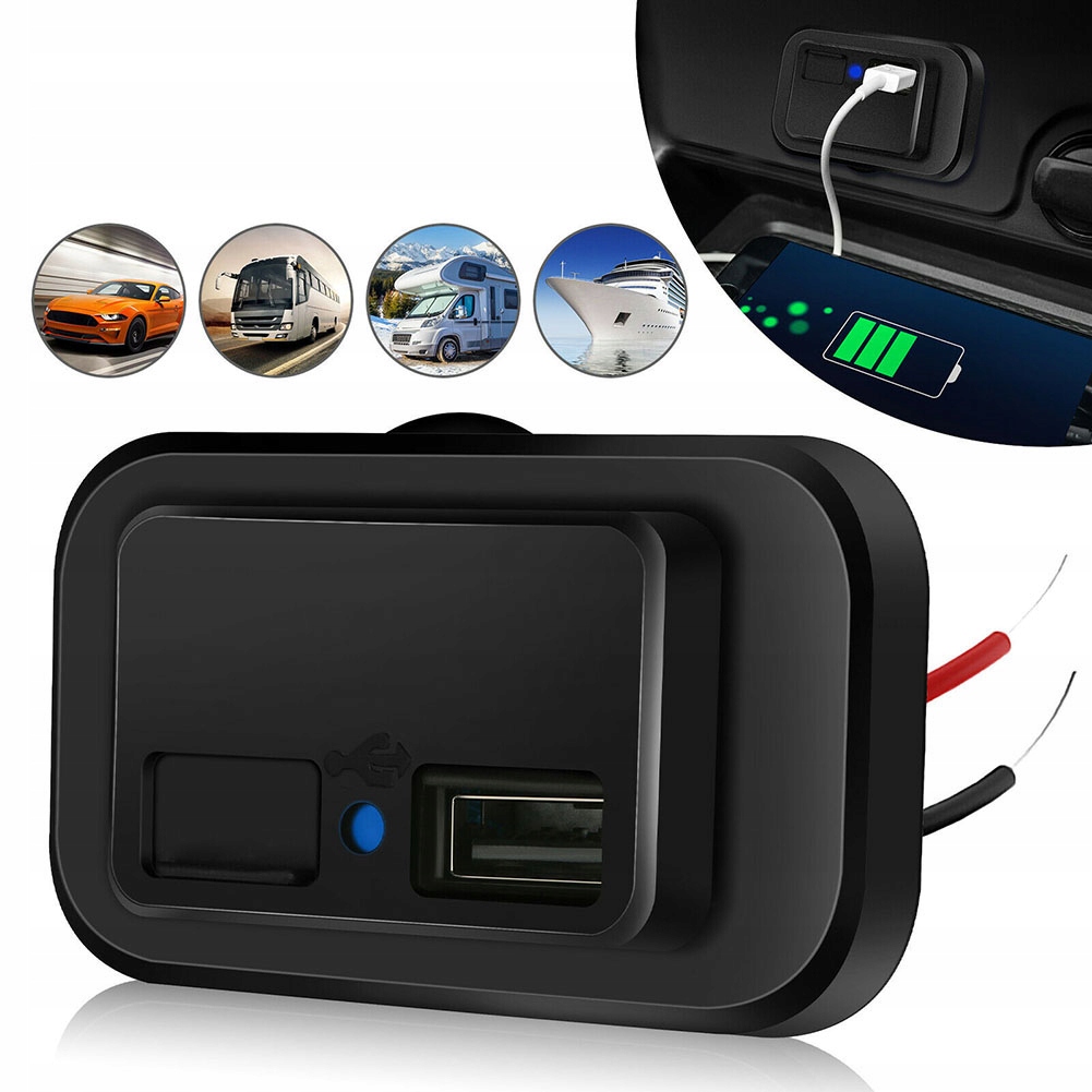 - широкий спектр застосування: підходить для автомобілів 12 В, човнів, мотоциклів, квадроциклів, караванів і т. д. підходить для зарядки мобільних телефонів, GPS, цифрових камер та інших аксесуарів USB і т. д.< / п>