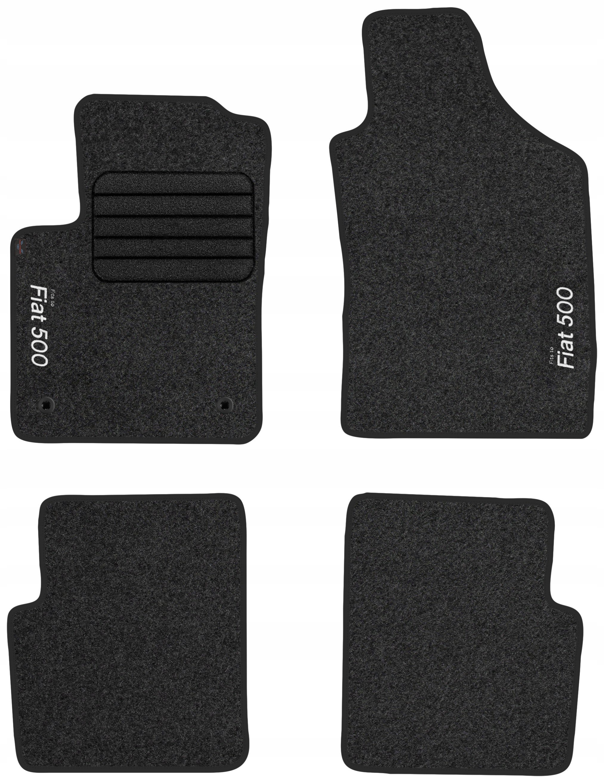 на передніх килимках виконується інформаційний напис методом прямої вишивки на килимках з написом "Fiat 500". Завдяки сучасному виробничому обладнанню і використанню високоякісних матеріалів і ниток, вишивка на килимках є міцною і естетичною, що в додаванні позитивно впливає на презентацію килимків в салоні автомобіля. Зміст напису на килимках відповідає основній фотографії (в залежності від моделі або марки автомобіля), а над цим написом тонким шрифтом нанесено напис "Fits to", яка повідомляє про призначення килимків.е>