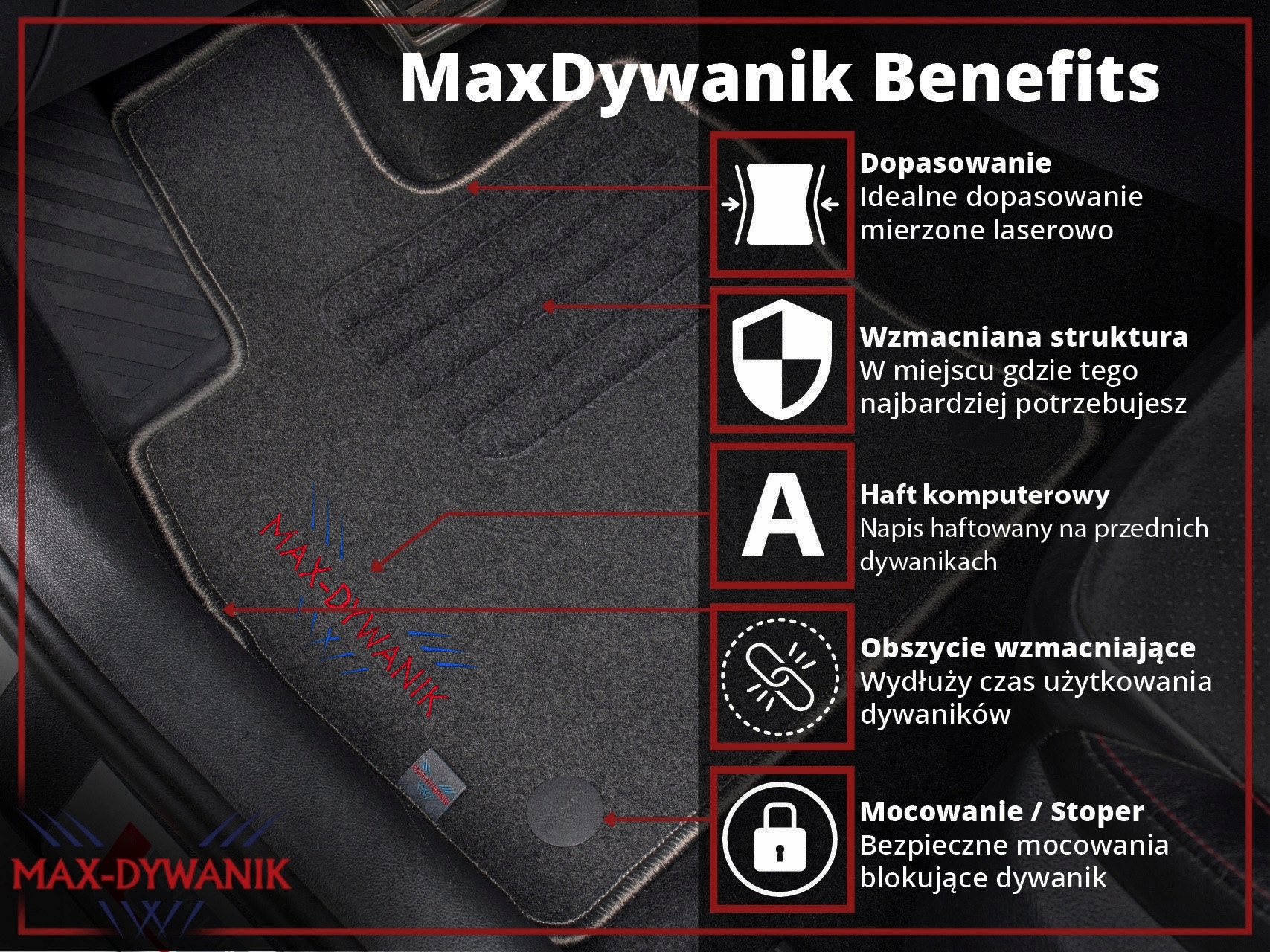 основною перевагою пропонованих килимків є посилене посилення на килимку водія. Завдяки застосуванню інноваційної технології ультразвукового зварювання футеровки отримано дуже естетичний продукт, основною перевагою якого є висока довговічність і функціональність. Килимки отримали новий унікальний дизайн і в той же час усунули недолік накладних підсилень (вистукування або стирання ниток)