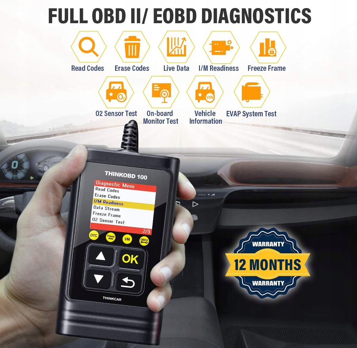 THINKOBD 100 OBD2 сканер OBD2 / EOBD автомобільний зчитувач кодів з повною функцією OBD2, універсальний інструмент для сканування світла двигуна / датчика O2 / EVAP системи