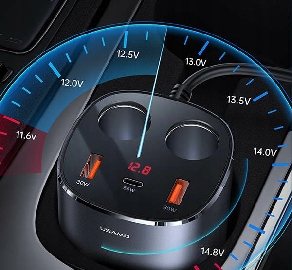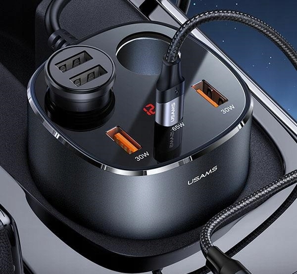 компактний автомобільний зарядний пристрій 5в1 має два розгалужувачі для прикурювача, два порти USB 30 Вт і один вхід USB-C 65 Вт.
