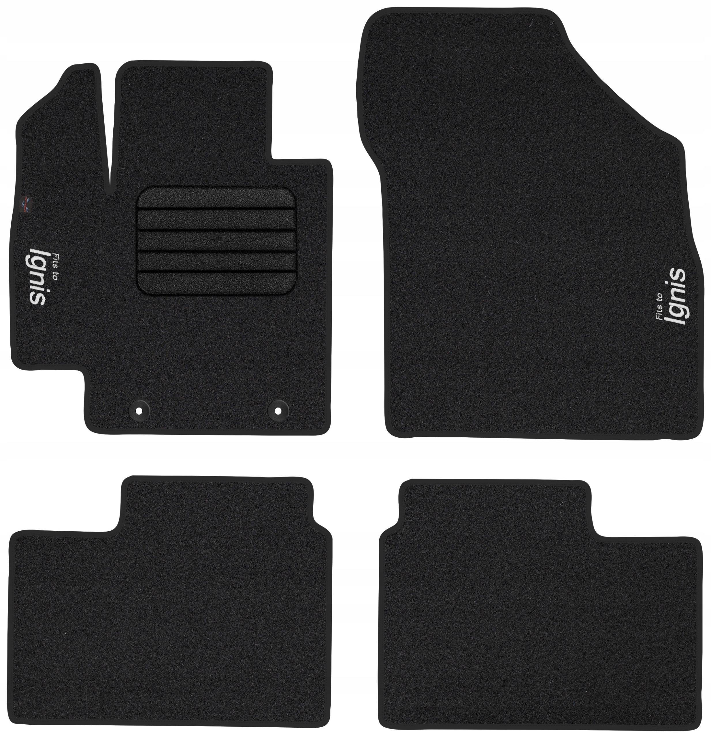 на передніх килимках виконується інформаційний напис методом прямої вишивки на килимках з вмістом "Ігніс". Завдяки сучасному виробничому обладнанню і використанню високоякісних матеріалів і ниток, вишивка на килимках є міцною і естетичною, що в додаванні позитивно впливає на презентацію килимків в салоні автомобіля. Зміст напису на килимках відповідає основній фотографії (в залежності від моделі або марки автомобіля), а над цим написом тонким шрифтом нанесено напис "Fits to", яка повідомляє про призначення килимків.е>