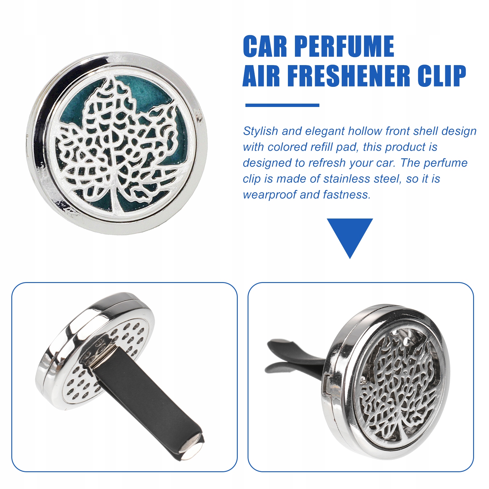 стильний і елегантний порожнистий передній корпус з барвистою заправкою, цей продукт призначений для оновлення вашого автомобіля.Затискач для духів виготовлений з нержавіючої сталі, що робить його зносостійким і довговічним. У поєднанні з ароматним скибочкою він стане привабливим і практичним прикрасою в автомобілі. е>