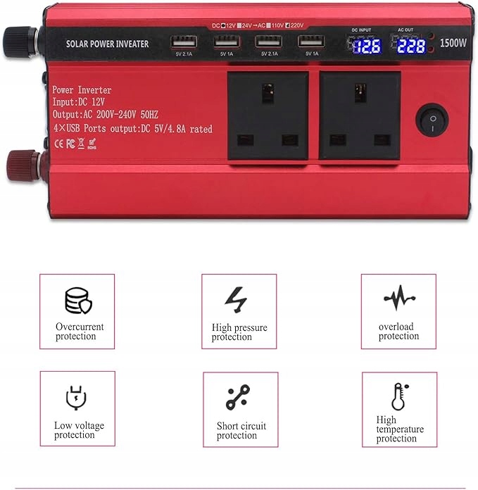 Постійна вихідна потужність: 500 Вт, імпульсна потужність: 1500 Вт (<10 мс) Модифікований інвертор синусоїдальної хвилі 12 В НА 240 В