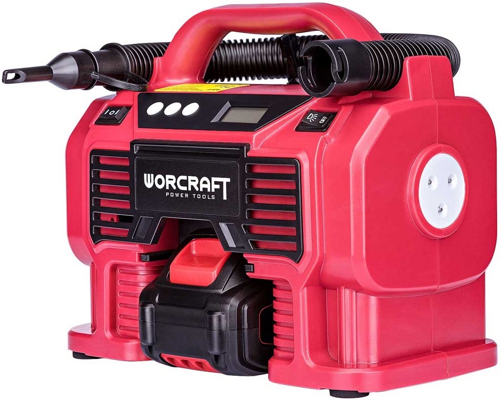 Акумуляторний компресор Worcraft CAC-S20LiA — надійний інструмент, призначений для накачування автомобільних шин, м'ячів і матраців. Компресор має регулювання тиску до 11 бар, що дозволяє підлаштувати пристрій під надувний елемент. При досягненні необхідного тиску насос автоматично вимикається.