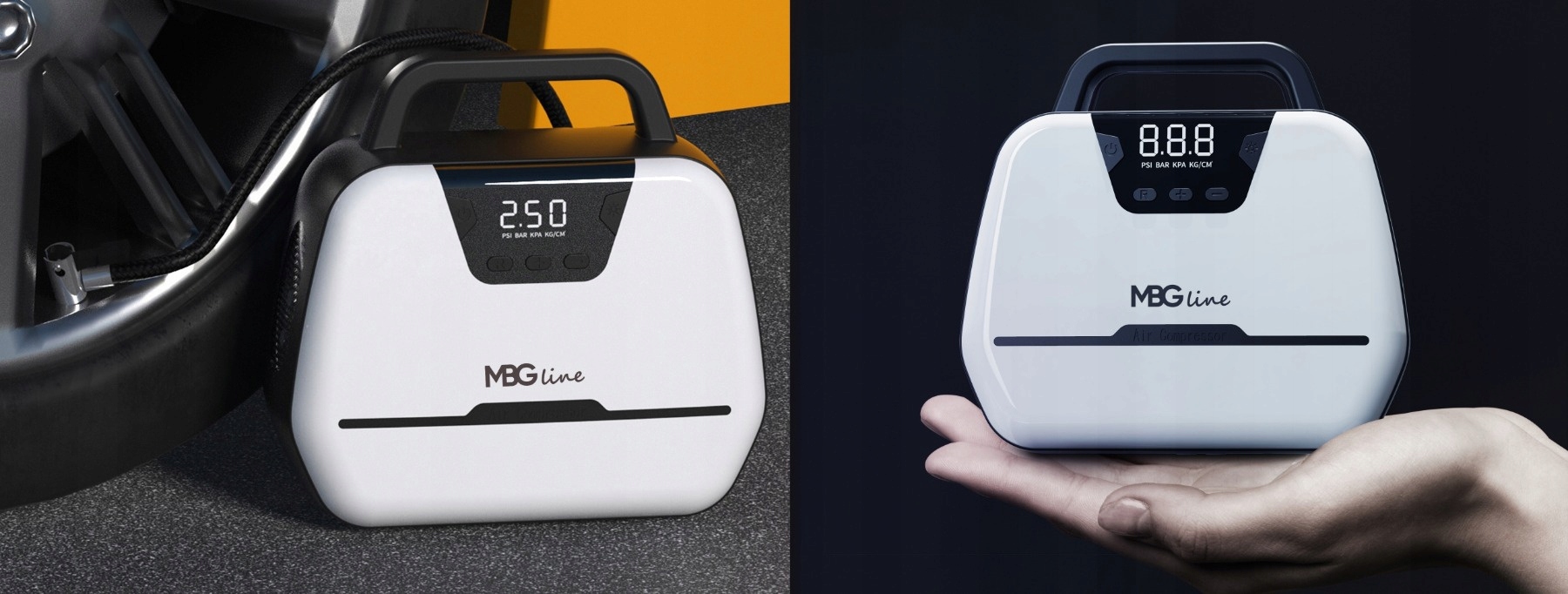 підключіть компресор до джерела живлення, встановіть кнопками "+" і "-" задане значення тиску, кнопкою M ви можете змінити блок (PSI / BAR / KPA / кг/см3) - увімкніть роботу компресора кнопкою праворуч.