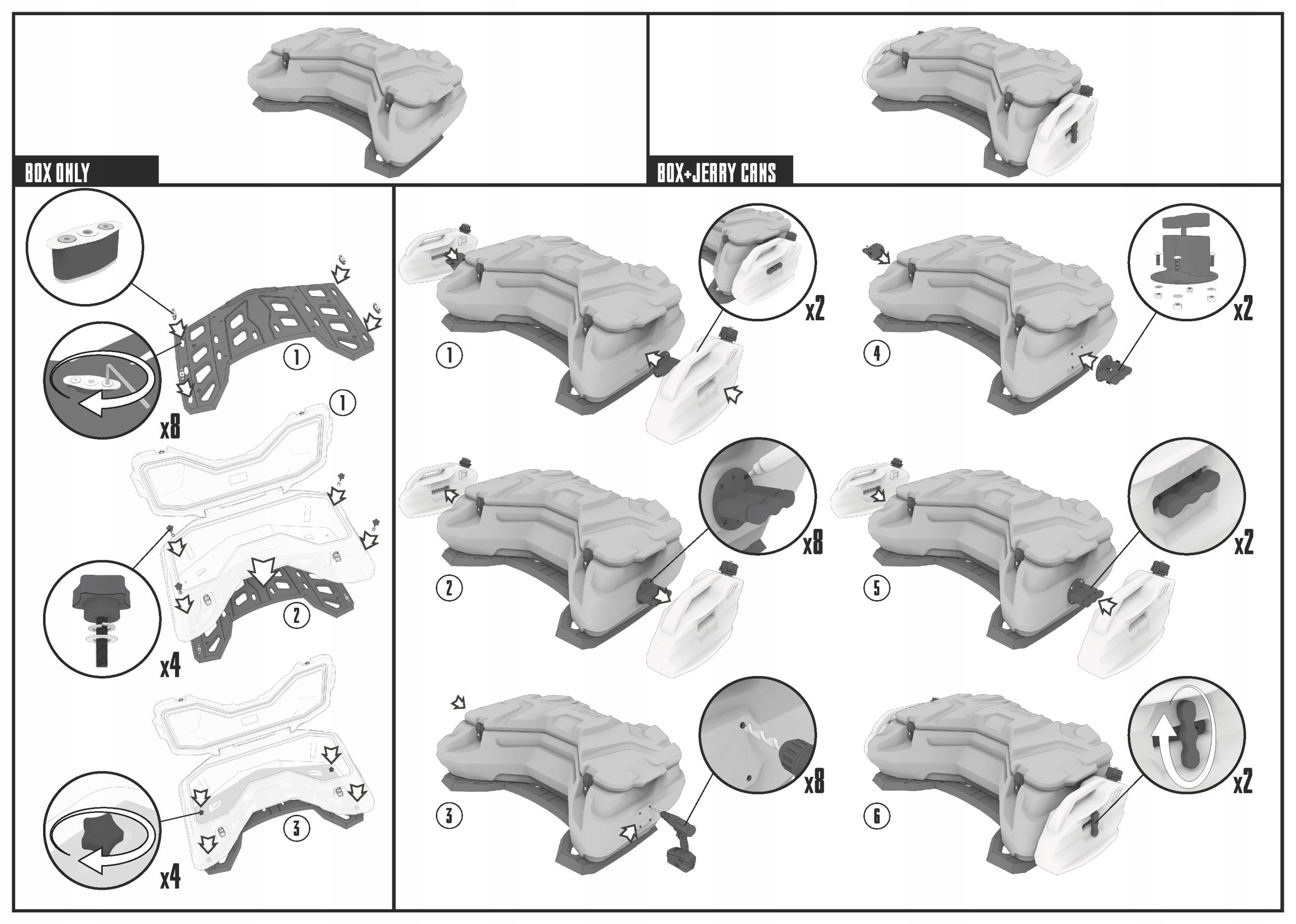 <е> Геометрія стовбура призначена для максимального використання задньої стійки . Ребра жорсткості забезпечують додаткову міцність конструкції і додають брутальності загальному образу квадроцикла. Це робить валізу не тільки функціональним, але і стильним аксесуаром.е> <е> Валіза має вбудовані 2 металевих замку і гумову прокладку, яка забезпечує щільну посадку кришки, що гарантує захист багажу. Для вашої безпеки продукт був оснащений відблисками, які роблять ваш ATV більш помітним на дорозі. Кофр встановлюється за допомогою швидкороз'ємних фітингів, що входять в комплект.е> <е> Корисним доповненням до продукту є дві каністри, прикріплені до бічних сторонах скрині (для покупки окремо) <е> Повний комплект: <е> Швидкороз'ємні фітинги-4 шт.;< / п> <е> Металеві замки-2 шт.;< / п> <е> відблиски-2 шт.< / п> <е> Розміри: 1120x640x330mm <е> Ємність: 110 л