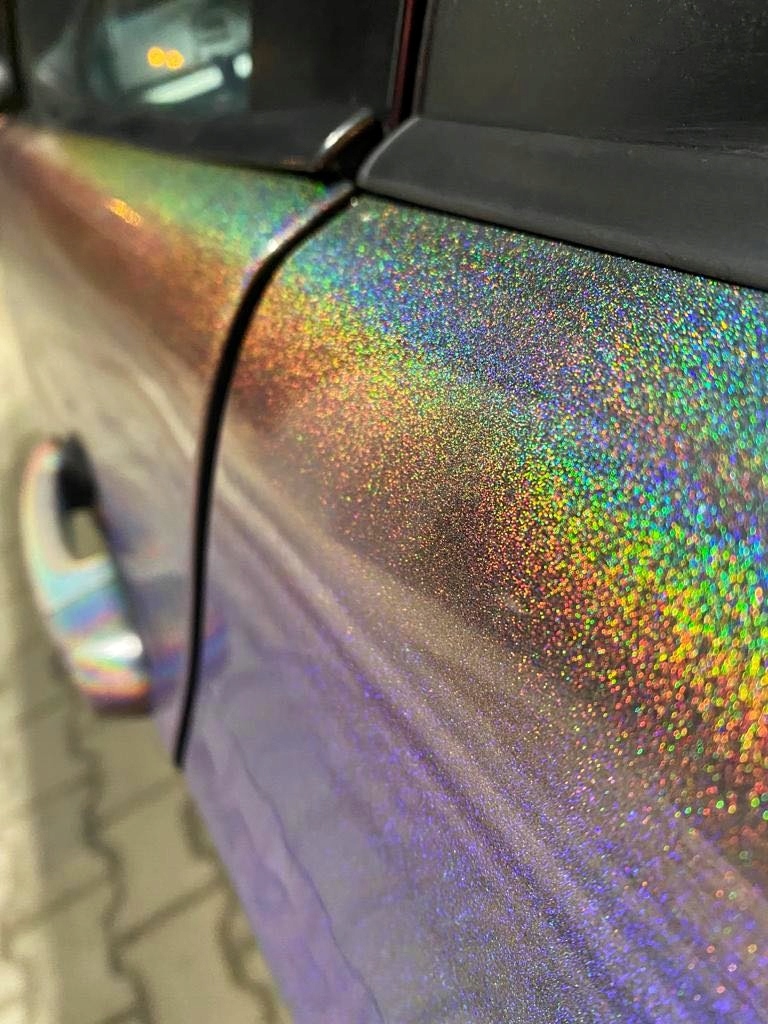 голографічна фарба працює за принципом заломлення світла. Коли світло потрапляє в колір, воно заломлюється і створює ефект, який ми знаємо з веселки. при зміні кута огляду зовнішній вигляд і положення райдужної дуги також змінюються. Без світла колір непомітний і позбавлений голографічного ефекту. Останній видно тільки в прямому світлі.