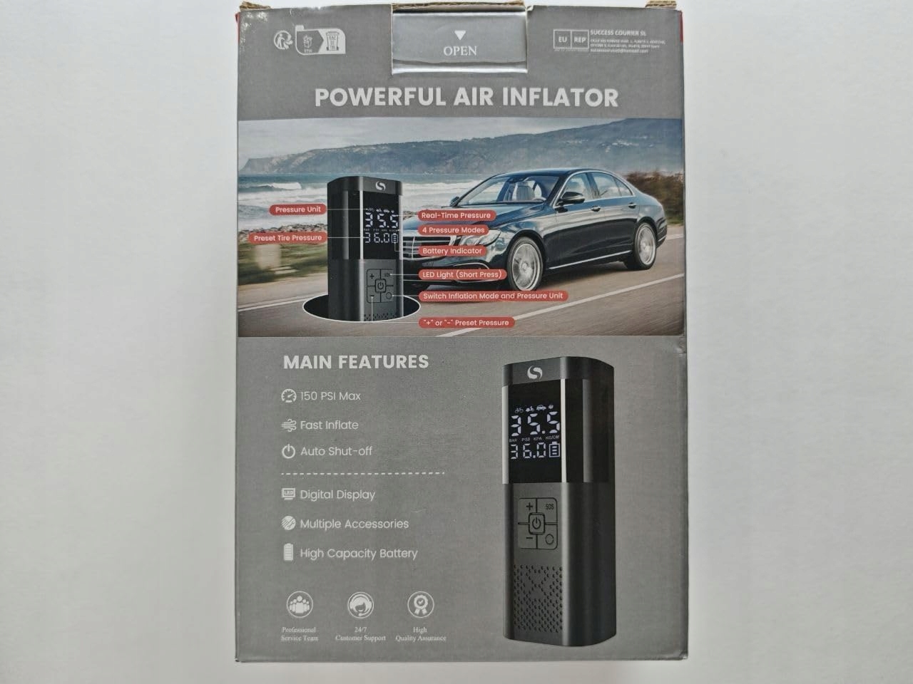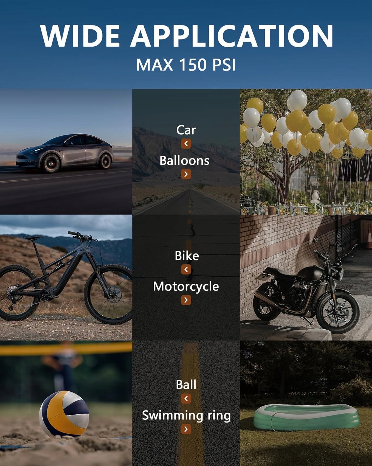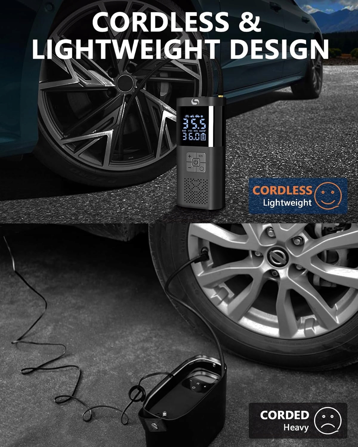 Подвійне джерело живлення: цей бездротовий електричний насос постачається з двома адаптерами живлення, ви можете вибрати між автомобільним джерелом живлення та джерелом живлення від акумулятора. Ця батарея компресора постачається з кабелем 12 В постійного струму, тож вам не доведеться турбуватися про те, що батарея розрядиться під час екстреної ситуації на дорозі! Легко носити: портативний міні-компресор має розміри лише 17,53 x 7,62 x 5,59 см і важить лише 0,42 кг. Він займає настільки мало місця, що його можна сховати де завгодно - в машині, в рюкзаку або навіть в сумці. Крім того, електричний повітряний насос ідеально підходить для подорожей, а також може використовуватися як аварійне джерело живлення для вашого мобільного телефону, оскільки в нижній частині є вихід USB. Багатофункціональність: портативний акумуляторний повітряний насос постачається з 5 додатковими допоміжними насадками для задоволення різних потреб. Електричний велосипедний насос може накачувати всі типи транспортних засобів, таких як мотоцикли та велосипеди, а також надувати мариновані кульки та плавальні кільця. Спалах і цифровий дисплей: електричний повітряний насос оснащений 3 режимами світлодіодного освітлення (освітлення/стробоскоп/SOS). Надяскраві ліхтарі допомагають накачати та замінити шини вночі, режими стробоскопа та SOS корисні для екстреного порятунку. Акумуляторний велосипедний насос оснащений великим цифровим дисплеєм, який відображає точні дані в режимі реального часу, тому ви можете з першого погляду визначити свій тиск у шинах. Швидке та безпечне накачування: більше ніяких тривалих накачувань, наш бездротовий акумуляторний компресор зарядить ваші автомобільні шини 195/55/R15 за 5 хвилин від 0 до 35 psi. Просто встановіть потрібний тиск, і електричний повітряний насос автоматично вимкнеться, коли буде досягнуто встановленого тиску. Вам не доведеться турбуватися про накачування велосипедного насоса електричним способом.