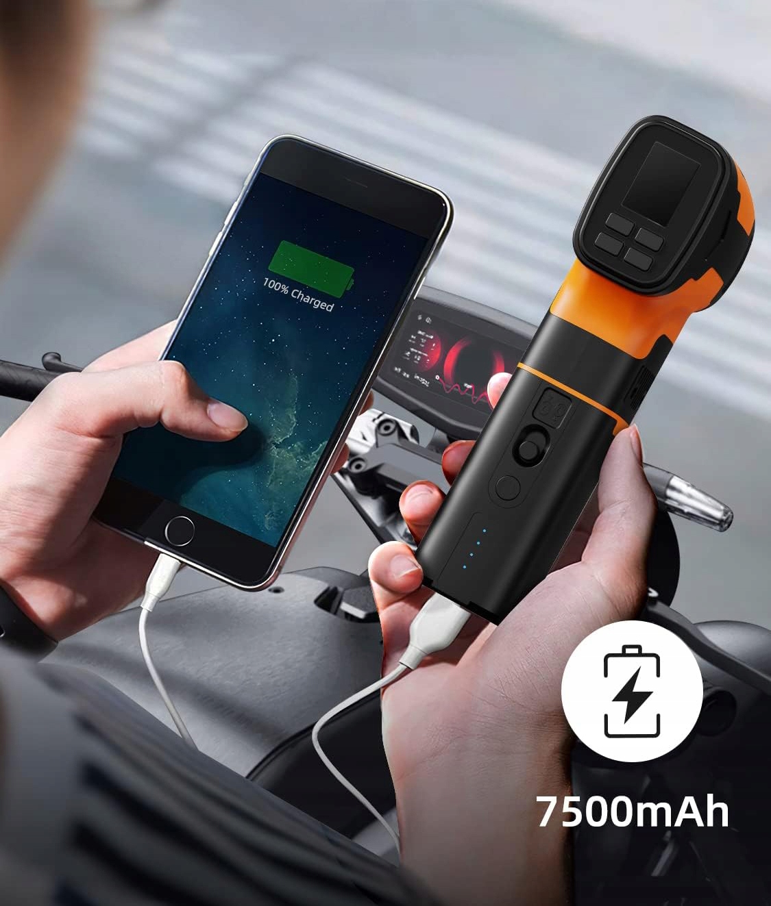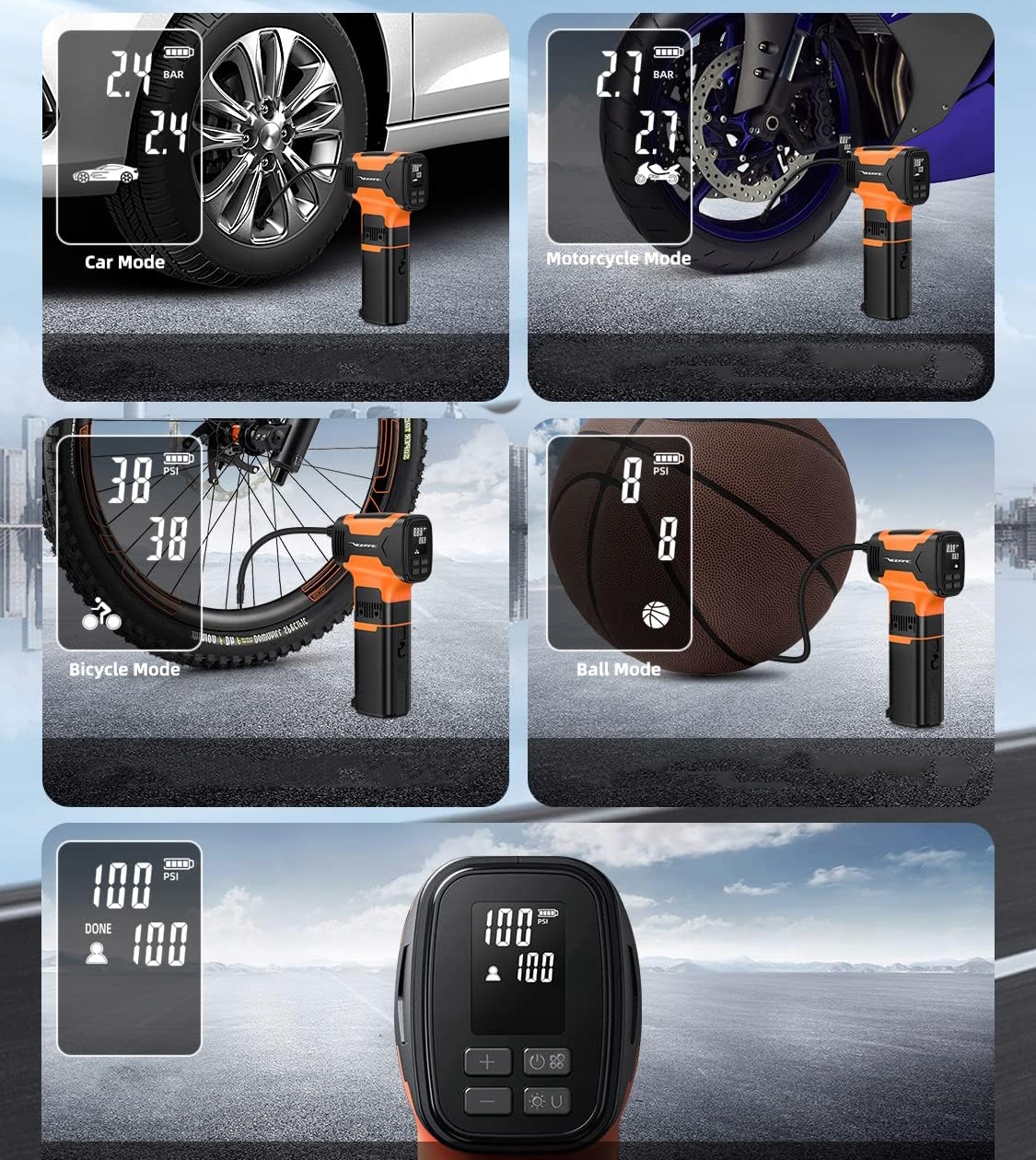 Комбінація акумуляторного модуля + компресорного модуля дозволяє отримати шинний компресор з тиском до 160PSI, з приєднаним повітряним шлангом, клапаном Presta, голкою для спортивного м’яча, можна швидко накачати шини, баскетбольні м’ячі, тощо.