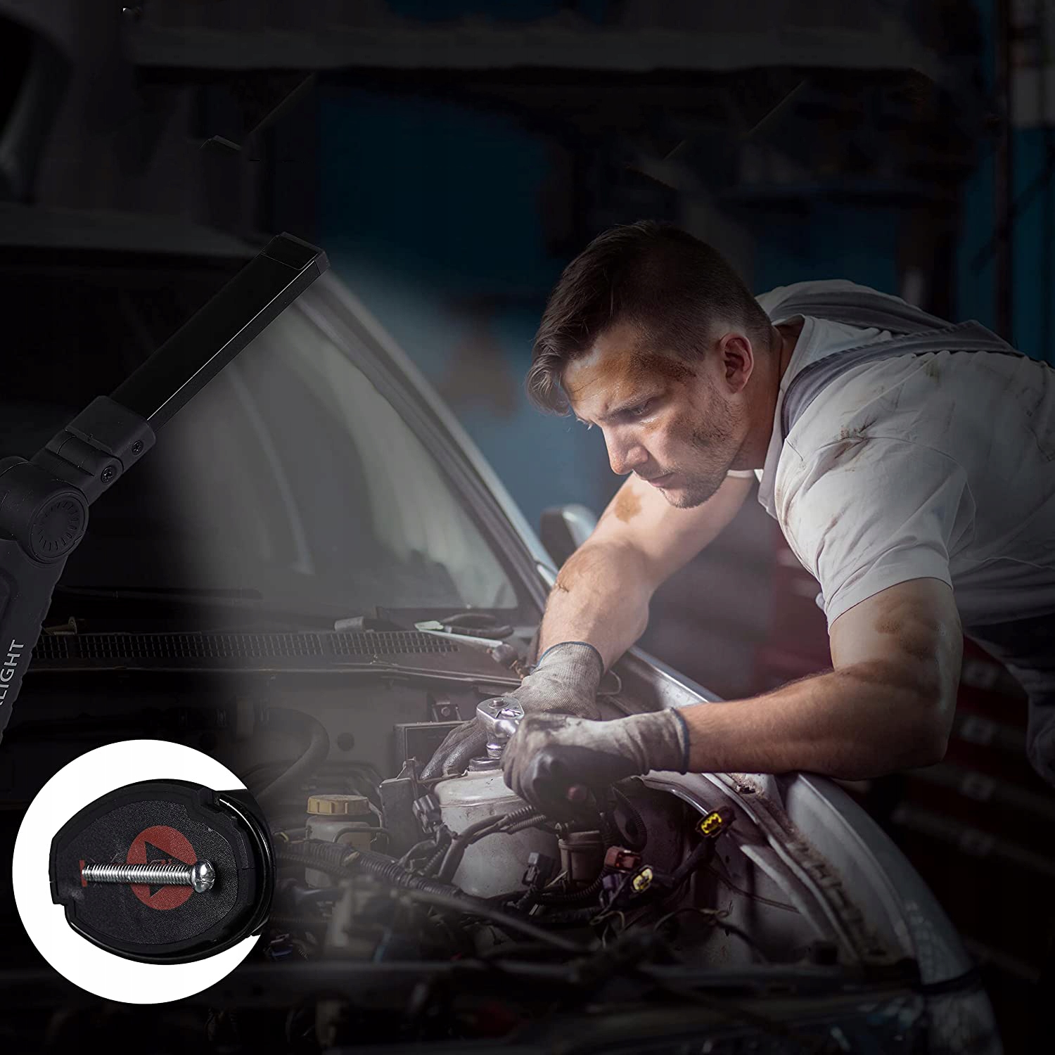 оснащений сильним магнітним тримачем для кріплення лампи до металевих поверхонь.