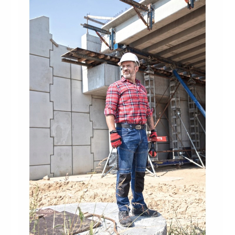 джинсові робочі штани slim fit Lahti Pro модель l40510. Штани виготовлені з матеріалу з дуже високою щільністю 340 г / м2 (70% бавовни, 28% поліестеру, 2% еластану). Штани мають 12 кишень, у тому числі два із застібкою-липучкою. Кишеня для мобільного телефону захищена тканиною, що відбиває електромагнітне випромінювання(EMF cell Phone Protection) . Матеріал, який використовується для пошиття штанів L40510, з додаванням розтяжки, що забезпечує гнучкість і комфорт під час використання. Джинсові штани Lahti Pro l40510 мають подвійну строчку і додаткове посилення швів в промежині, що робить їх дуже міцними. У джинсових штанах використовується інноваційна регулювання ширини талії за допомогою спеціальної конструкції з еластичною стрічкою. Вона полягає в тому, що штани на талії самі по собі підходять до фігури. Є можливість купити пояс для брюк з символом l9020200. Крім того, штани мають вушко для ключів і петлю для молотка. Посилені кишені і кишені для захисту колін модель lpn001 матеріалом (600D поліестер) який дуже стійкий до стирання. Приталений крій відрізняється облягає одягом, що підкреслює силует і дуже сучасною. У штанах є ідентифікаційна вшивка. Джинси Lahti Pro l40510 входять в першу категорію засобів індивідуального захисту. Вони мають декларацію CE і відповідають стандартуEN ISO 13688 .е>