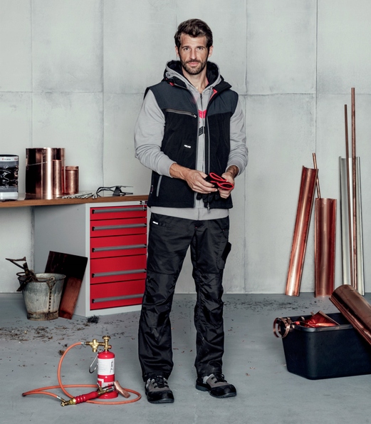 сучасні та зручні робочі штани для майстрів сірого кольору еластичні та зручні штани з колекції Stretch X виготовлені з еластичного еластичного матеріалу (72% бавовна, 25% поліестер, 3% спандекс). Забезпечує максимальний комфорт і оптимальну свободу рухів. Завдяки еластичному поясного ременя і ергономічним областям колін штани зручно пристосовуються до всіх рухів під час повсякденної роботи. Ці штани мають сучасний дизайн і доступні в 5 інших кольорах для всіх галузей промисловості. Будь то складування та логістика, промисловий сектор та/або багато інших професій – з сірими робочими штанами ви добре підготовлені до своєї роботи. Міцні штани з інноваційними і добре продуманими деталями приховані гудзики цих робочих штанів захищають чутливі поверхні і запобігають подряпини. Кишеня для мобільного телефону з функцією E-care захищає організм до 99% від небезпечного електромагнітного випромінювання. У 6 практичних зовнішніх кишенях, 2 кишенях для ручок, затискачах для посвідчень особи і кишенях на метр ви можете надійно і практично заховати робочі інструменти або предмети. Робочі штани ідеально поєднуються з нашим сірим робочим жилетом Stretch X. міцні потрійні шви також забезпечують тривалий термін служби штанів. Світловідбиваючі вставки підвищують безпеку в умовах поганої видимості. З колінними кишенями, сертифікованими EN 14404 для наколінників, робота та інші дії можуть виконуватися безболісно і м'яко, коли ви стоїте на колінах.