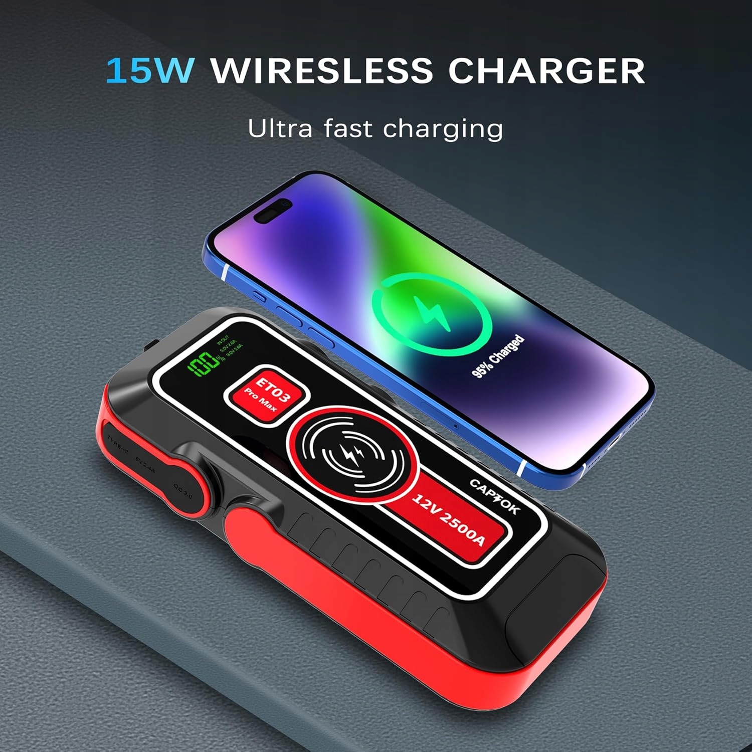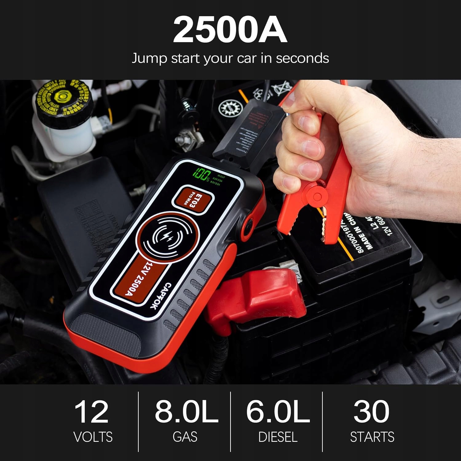 Ефективний акумулятор із легким запуском. Цей компактний і ефективний літієвий пусковий пристрій на 2500 А запускає розряджену батарею 12 В за секунди - до 30 швидких запусків на одному заряді. Підходить для бензинових двигунів об’ємом до 8 л і дизельних двигунів об’ємом до 6 л, позашляховиків, мотоциклів, автомобілів, газонокосарок, снігоходів тощо.