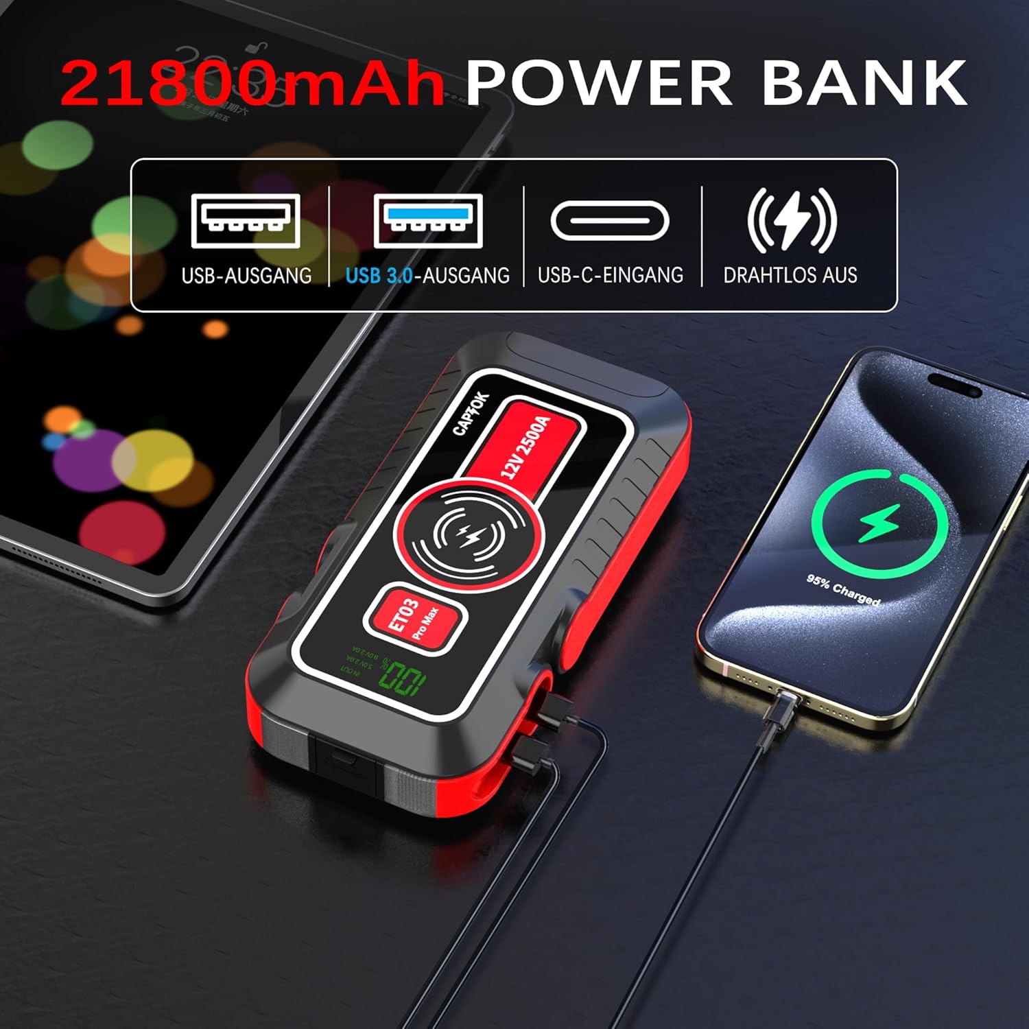 Портативний блок живлення: велика ємність 21800 мА, оснащений 15 роз’ємами бездротової швидкої зарядки , 1 USB: 5V-2A, 9V-2A, 1 порт швидкої зарядки: 5V-2A, 5V-3A, 9V-2 A (QC-3.0), 1 роз'єм для зарядки типу: 5V-2A, 9V-2A. Можливість заряджати 3 пристрої одночасно.