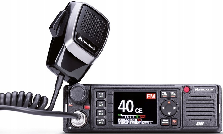 Midland m-88 представляє останні тенденції в створенні CB в світі.має великий кольоровий дисплей на передній панелі . M - 88 може живитися від напруги 12 В і 24 в. Радіо має функцію DS (Digital Squelch) і безліч інших цікавих технічних рішень.