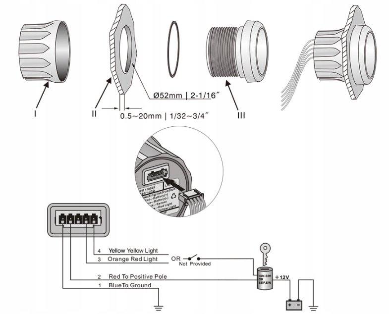 IP67 водонепроникний, кроковий двигун, захист від зворотної полярності , червоний або жовтий фонове світло * відображає стан генератора і батареї. Аномальні напруги можуть відображатися точно * використовуйте принцип руху магніту для приводу голки, що відрізняється хорошою міцністю і антивібрацією * Матеріал рами: SUS316, двошарове протитуманне скло * розмір установки: 52 мм(2 ") * Установка: зафіксуйте індикатор на плінтусі безпосередньо вручну * роз'єм: інтегруйте патч-корд 12 в/24 в * фонове світло: червоний або жовтий * діапазон індикації: 8 ~ 16 в * Робоча напруга: 12 В * сигнал: 8 ~ 16 в * клас захисту: IP67; IP65 на задній стороні
