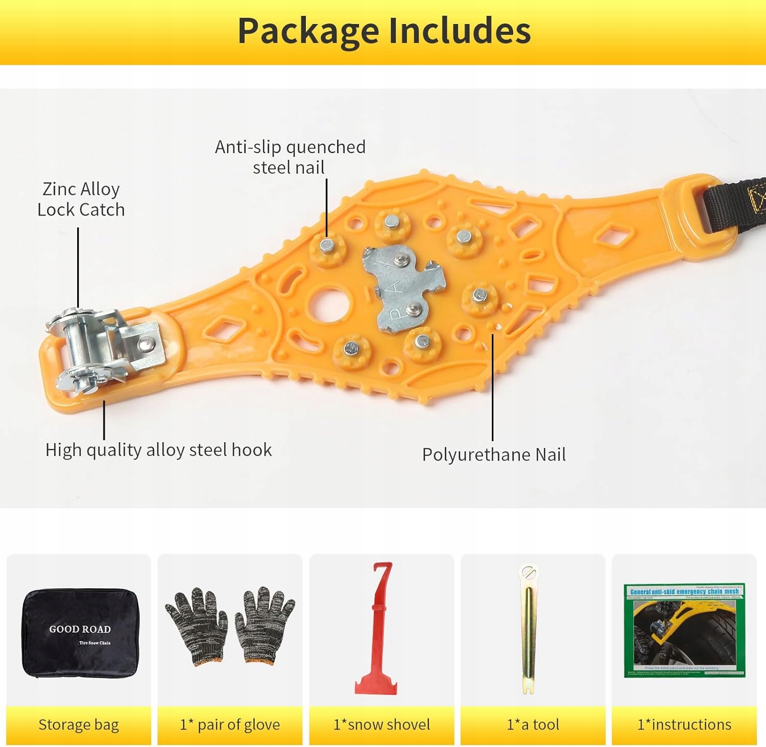 Покращене зчеплення та здатність розбивати лід: ці автомобільні ланцюги протиковзання мають високоміцні загартовані болти та циліндричні кронштейни, які забезпечують відмінне зчеплення та здатність розбивати лід. 6 циліндрів з нержавіючої сталі та 14 циліндричних TPU опор у поєднанні зі зносостійкою конструкцією гачків Aquiline ефективно запобігають ковзанню на льоду.