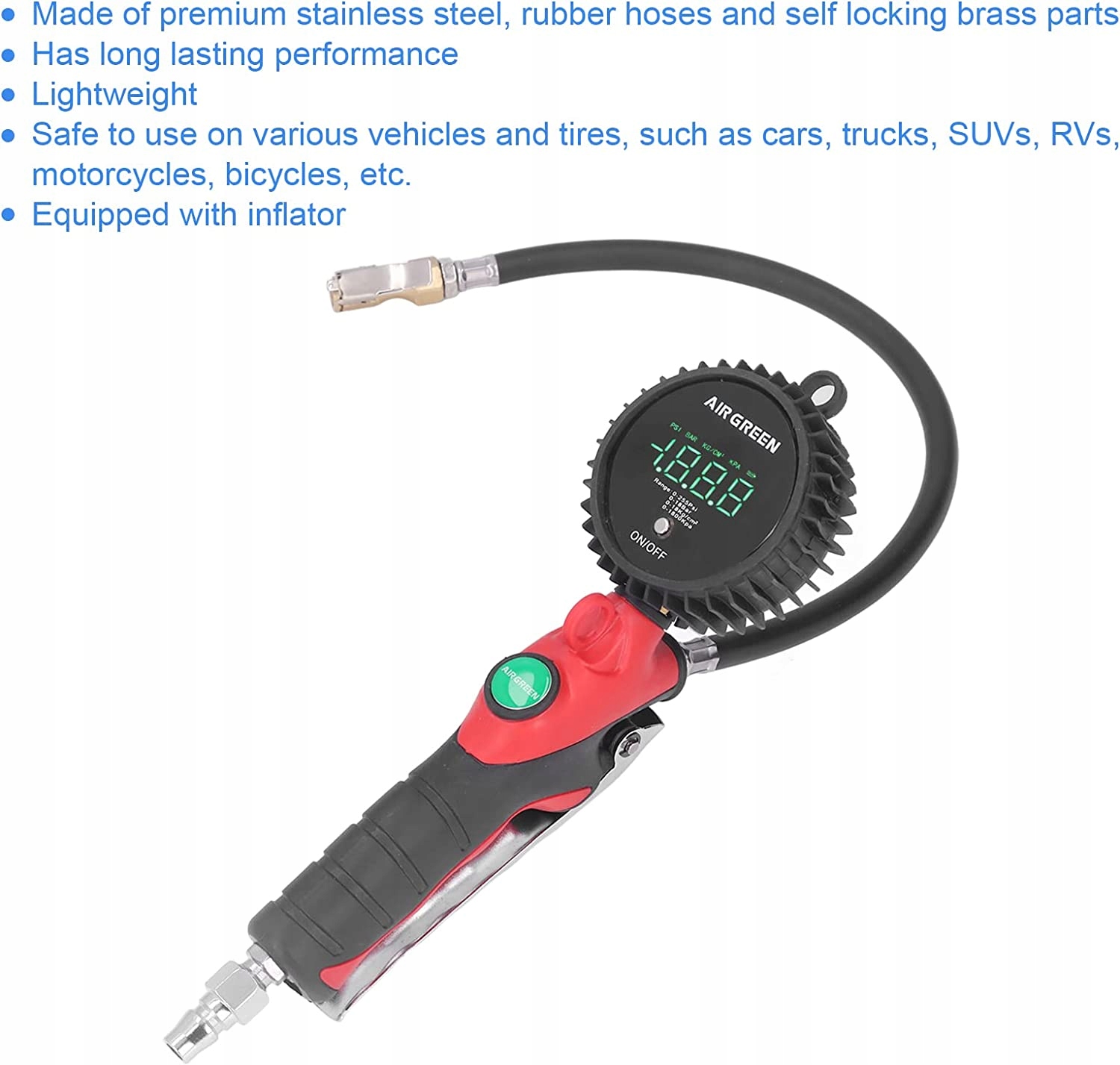 висока dokadno цей манометр протестований і сертифікований під ktem продуктивність dokadno вимірювання становить до 1 з дозволами провітрювання 01 psi для максимальної dokadno вибір 4 одиниці Dobdne s чотири Rone одиниці виміру 0255psi 018bar 018 KGCM2 01800kpa ергономіка цей датчик скорочення шин оснащений фіксаторами для всіх типів шин тригер великого пальця для накачування натискного типу ергономічно розроблений що зручно для накачування шин вбудований дефляція МНС швидко зменшить зменшення надутих шин оснащений надувним манометром з насосами для накачування шин перевірка і регулювання натяг шин відповідно до даної тишею матеріал преміум-класу виготовлений з високоякісної нержавіючої сталі гумові ви і самозакриваються мосіни цей інструмент для вимірювання тиску в шинах легкий і довговічний.